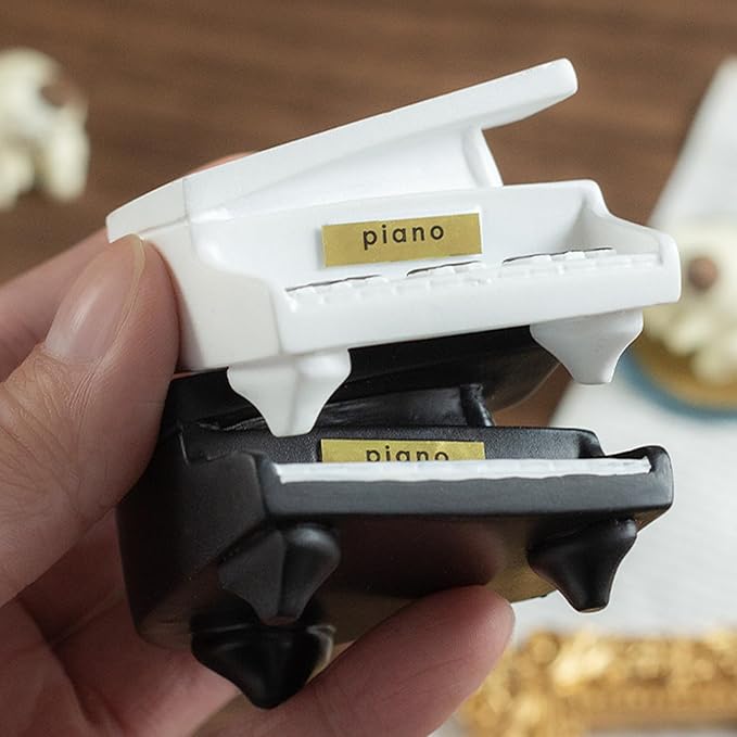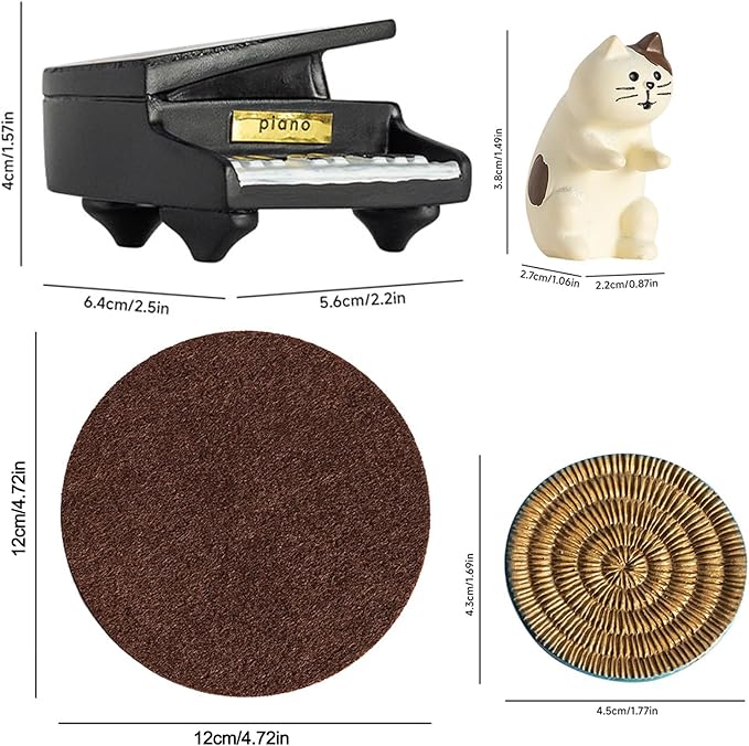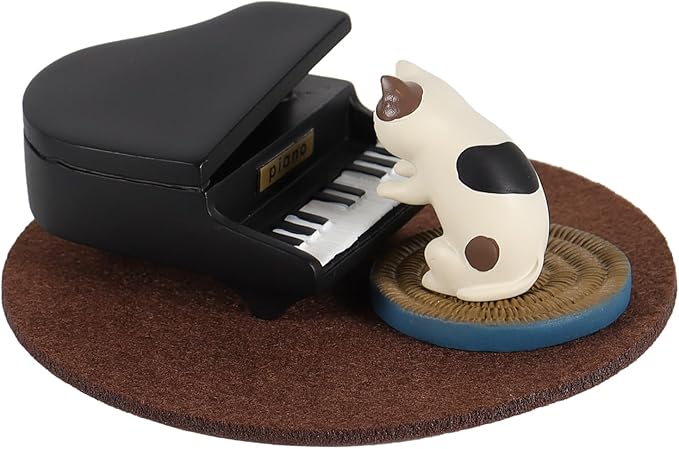 - Miniature Cat Figurines: This set of miniature cat figurines includes a pianist cat, a pianos, a cushion and a mat. Charming mini cat figurines designed as playful desk decor or office decor for women