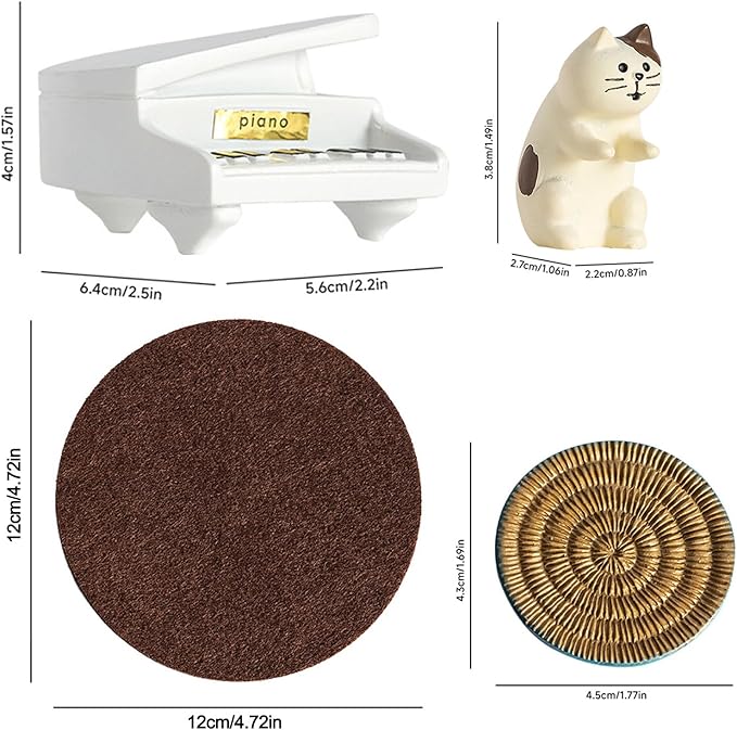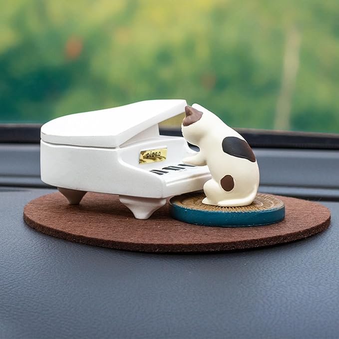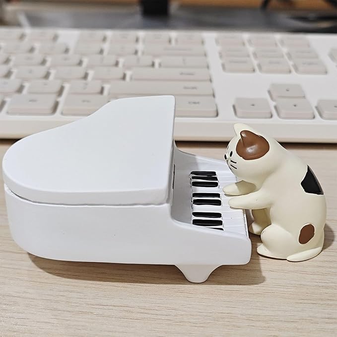 - Miniature Cat Figurines: This set of miniature cat figurines includes a pianist cat, a pianos, a cushion and a mat. Charming mini cat figurines designed as playful desk decor or office decor for women