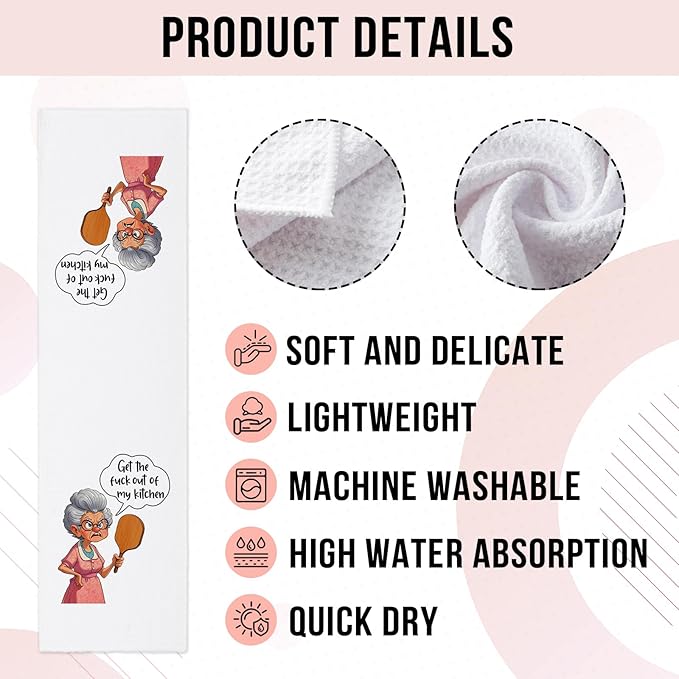 - Unique Design: Our funny kitchen towel with saying "Get The Fxxk Out of My Kitchen". The simple yet cute text patterns can bright up your kitchen and surprise your family and friends. It's a perfect kitchen gift for your favourite chef.