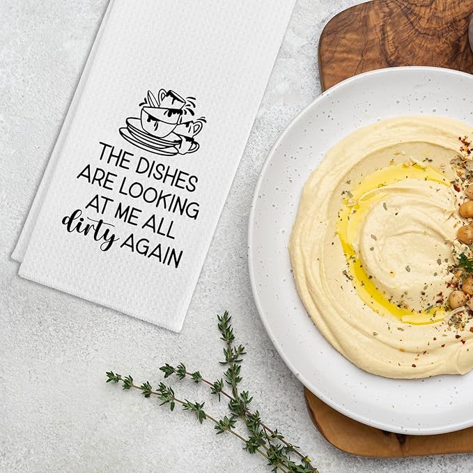 - Unique Design: Our funny kitchen towel with saying "The Dishes are Looking at Me All Dirty Again". The simple yet cute text patterns can bright up your kitchen and surprise your family and friends. It's a perfect kitchen gift for your favourite chef.