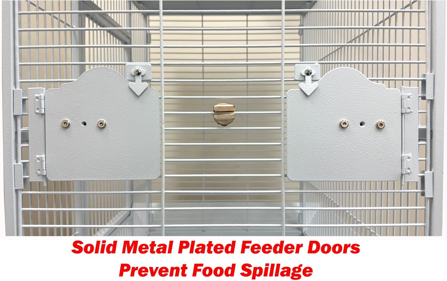 - 【Swivel Solid Metal Feeder Doors】 Prevent Spillage With Two Large 5" Stainless Steel Feeder Cups , Inside Natural Wooden Stand Perch Included.