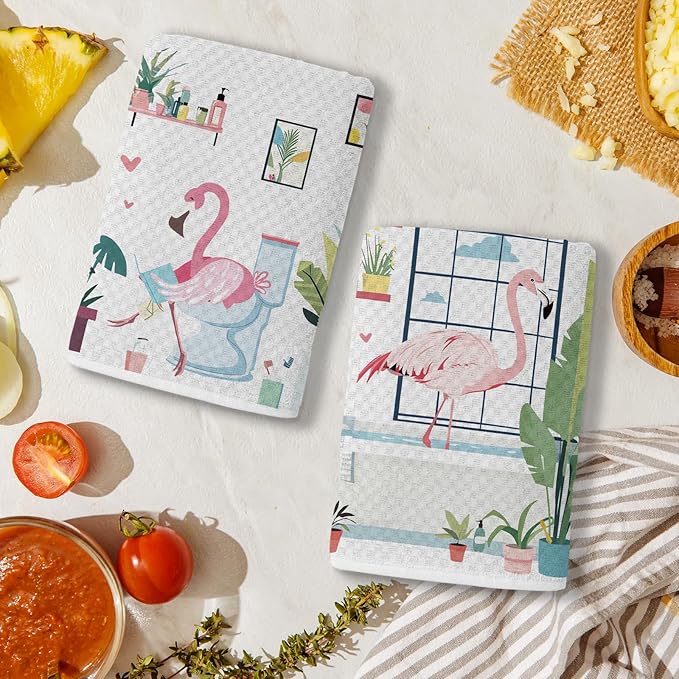 Pink Flamingo Decor Kitchen Towels for Bathroom Set of 2, Flamingo Bathroom Decor, Flamingo Gifts for Women, Cute Flamingos Waffle Weave Dish Towels 18x26 Inch