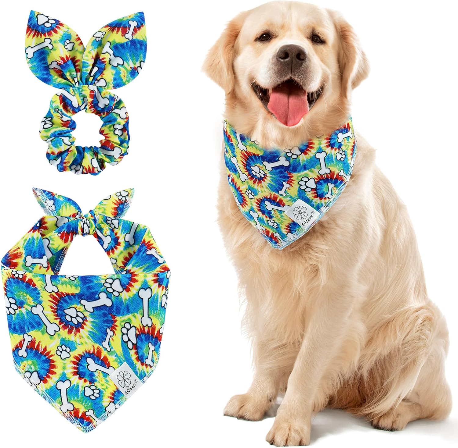 E-Clover Dog Bandanas Boy & Matching Scrunchie Set Girl Cute Rainbow Dog Scarf Bibs Pet Bandana with Bow Tie for Medium Large Dogs Owner Mom Pride