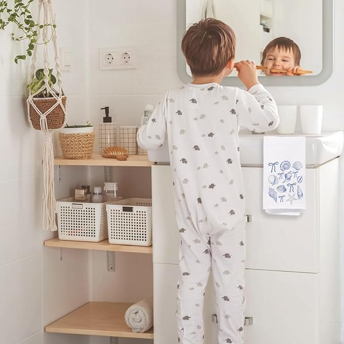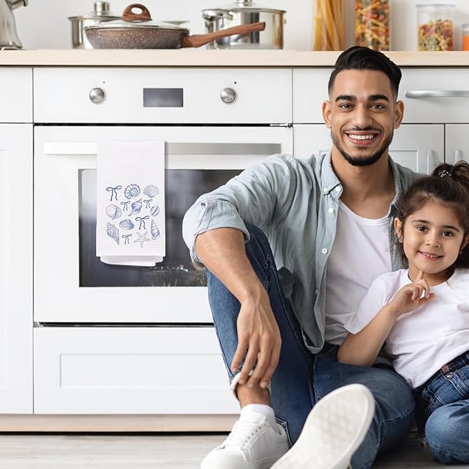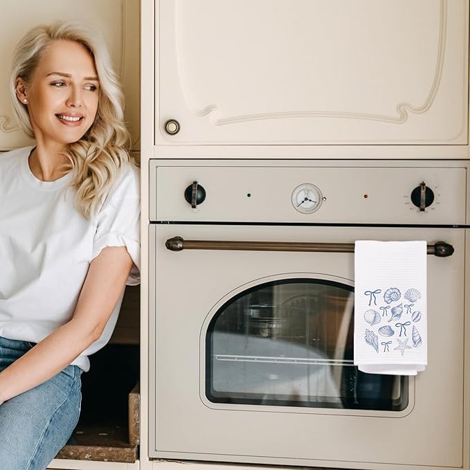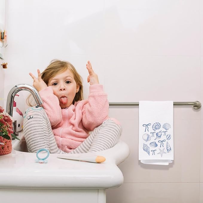 Coquette Blue Bow Seashell Beach Kitchen Towels, Preppy Blue Beach Hand Towels for Bathroom, Coastal Nautical Beachy Decorative Dish Tea Towels for Kitchen, 16x24 Inch