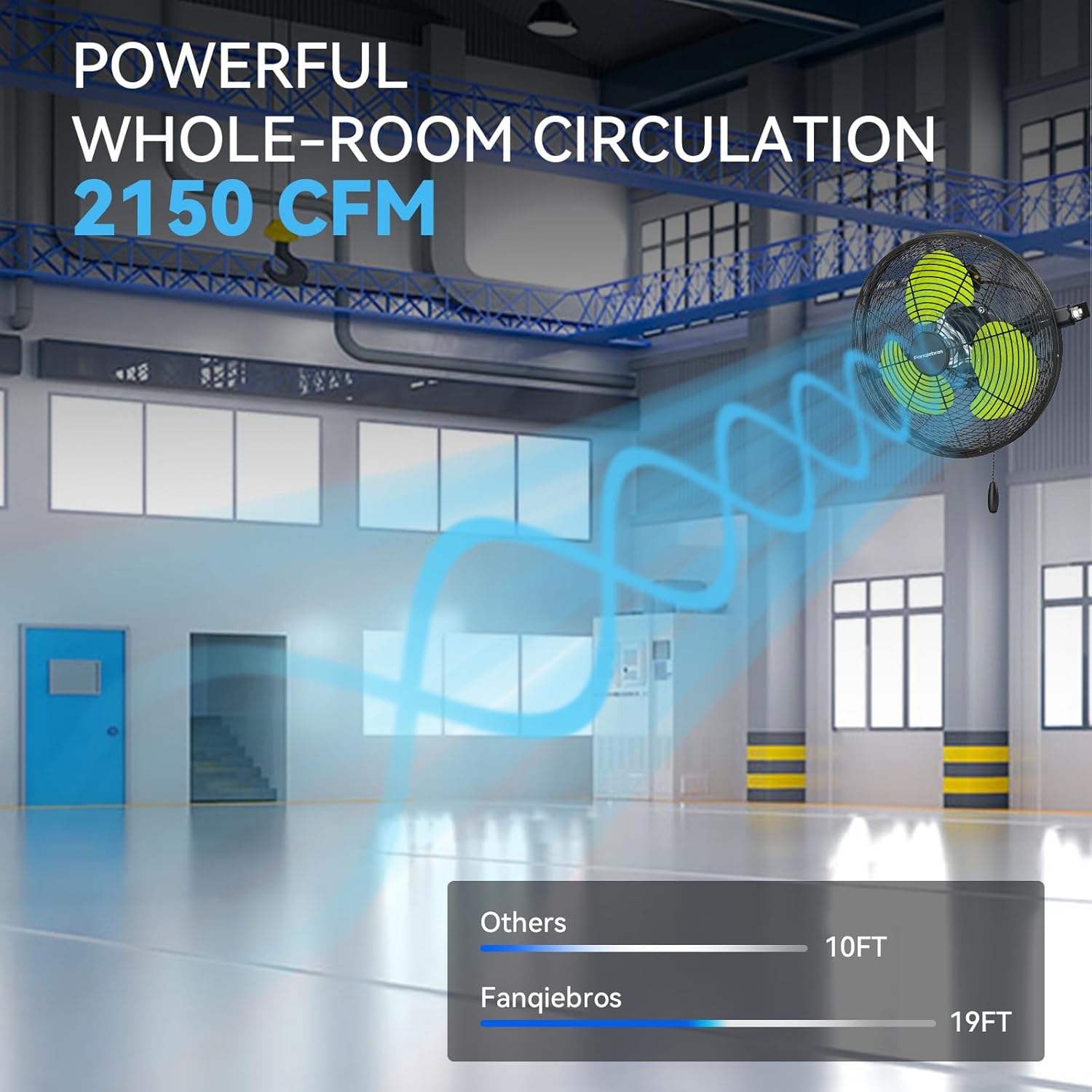 - 𝐇𝐢𝐠𝐡 𝐕𝐞𝐥𝐨𝐜𝐢𝐭𝐲 𝐀𝐢𝐫 𝐅𝐥𝐨𝐰 - Equipped with 3 adjustable wind speeds, low (1700CFM), medium (2100CFM) and high (2500 CFM), this wall fan utilizes the raw power of the pure copper motor to provide hurricane-like airflow to meet your garages, shops, covered patios, or anywhere else you need