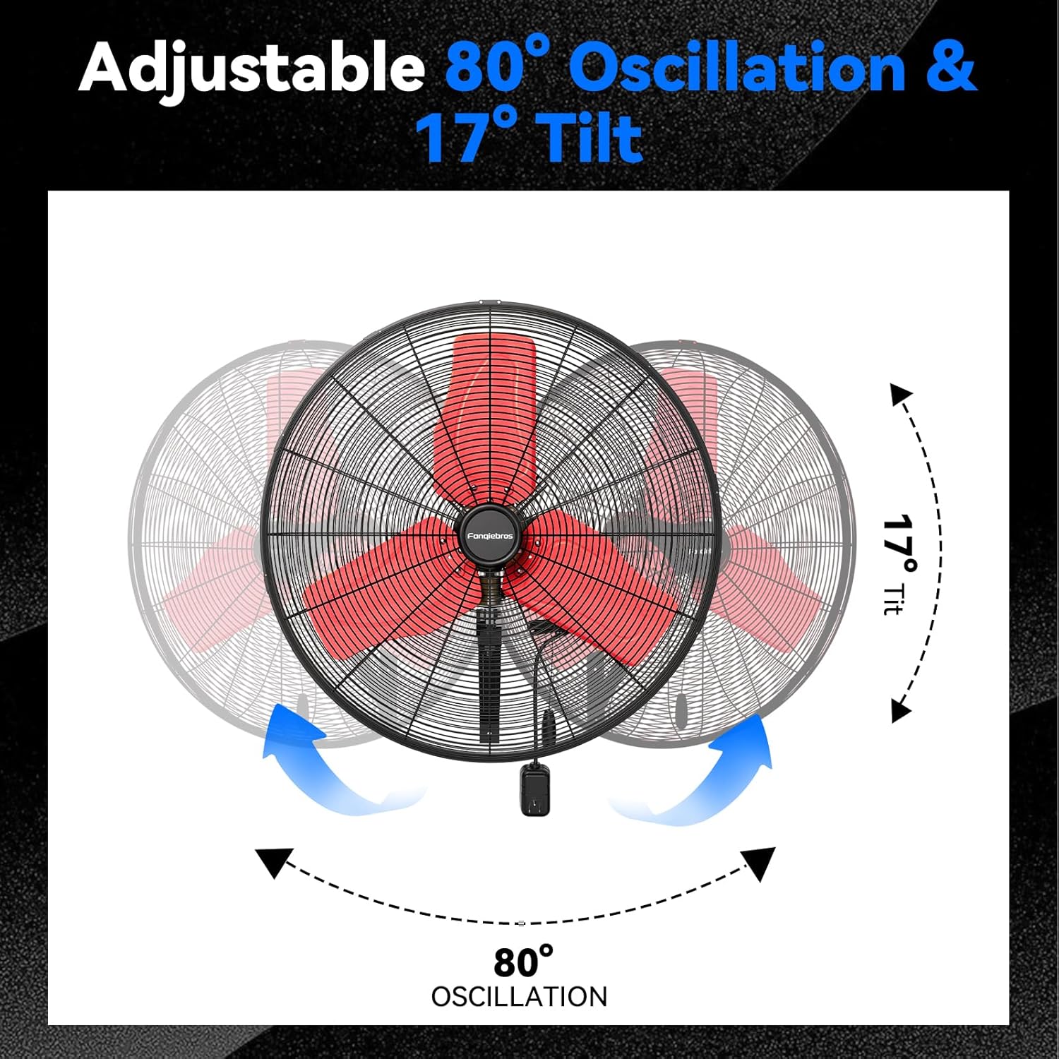 - 𝐓𝐢𝐥𝐭𝐢𝐧𝐠 & 𝐎𝐬𝐜𝐢𝐥𝐥𝐚𝐭𝐢𝐧𝐠 - The heavy-duty mental wall fan provides an automatic oscillation function of 80 degrees left and right, and the vertical tilt angle can be adjusted up to 17 degrees, helping you easily adjust the wind direction and enjoy the best comfort