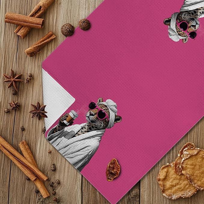 Trendy Sunglasses Leopard Hand Towels for Bathroom Decor, Leopard Drinking Coffee Kitchen Towels, Hot Pink Maximalist Cheetah Dish Tea Towels for Kitchen Decor, 16x24 Inches