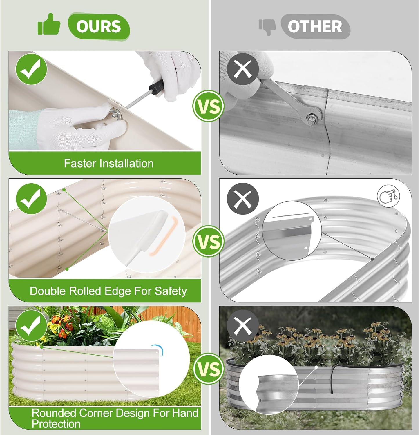 - 【Safe Edge Design】 The garden box features a folded design that eliminates sharp edges, ensuring safe installation. With rounded corners for additional hand protection, it offers dual safety, making it perfect for homes with children and pets