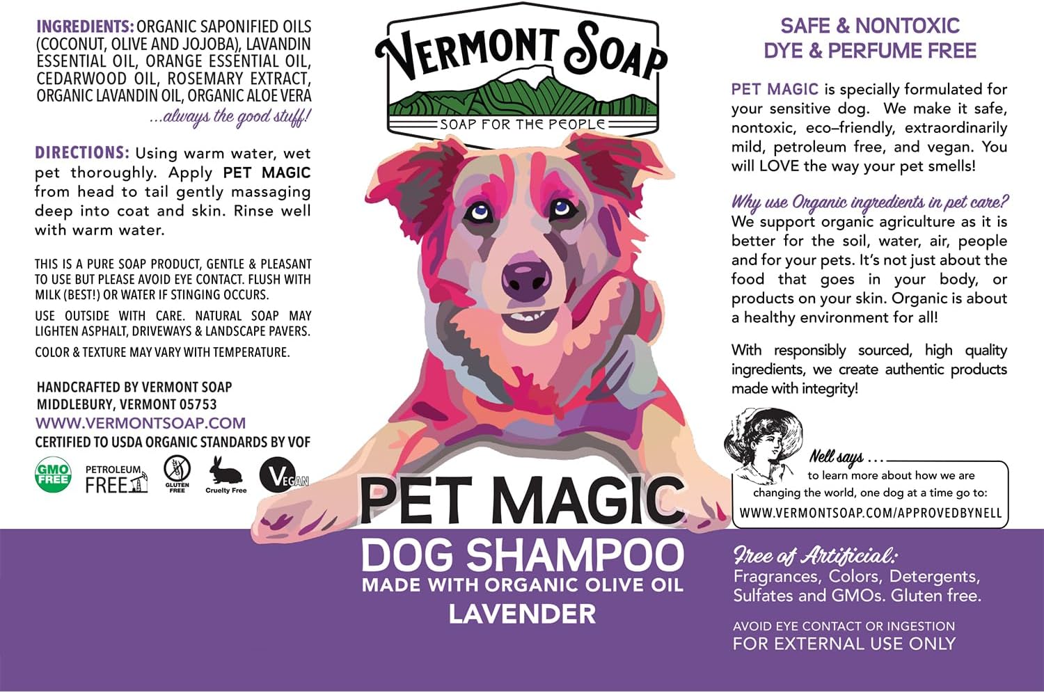 - USDA CERTIFIED: After passing all the federal guidelines, our Vermont Soap coconut dog shampoo is Certified by the USDA organic food standards. It means Vermont Soap only sells products that are natural and organic and approved by USDA.