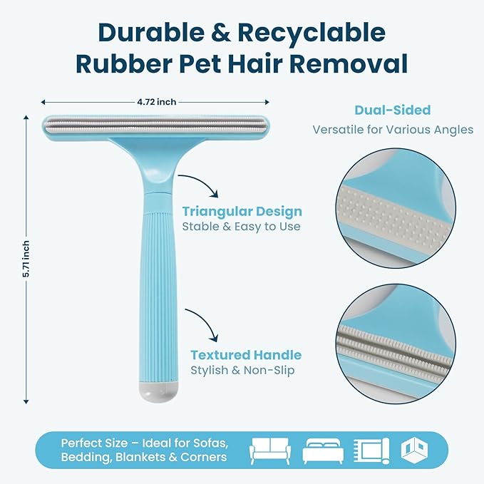 - Double-Sided Pet Hair Remover — Designed for use at various angles, this soft rubber tool efficiently removes pet hair from fabric couches, blankets, and cat beds.