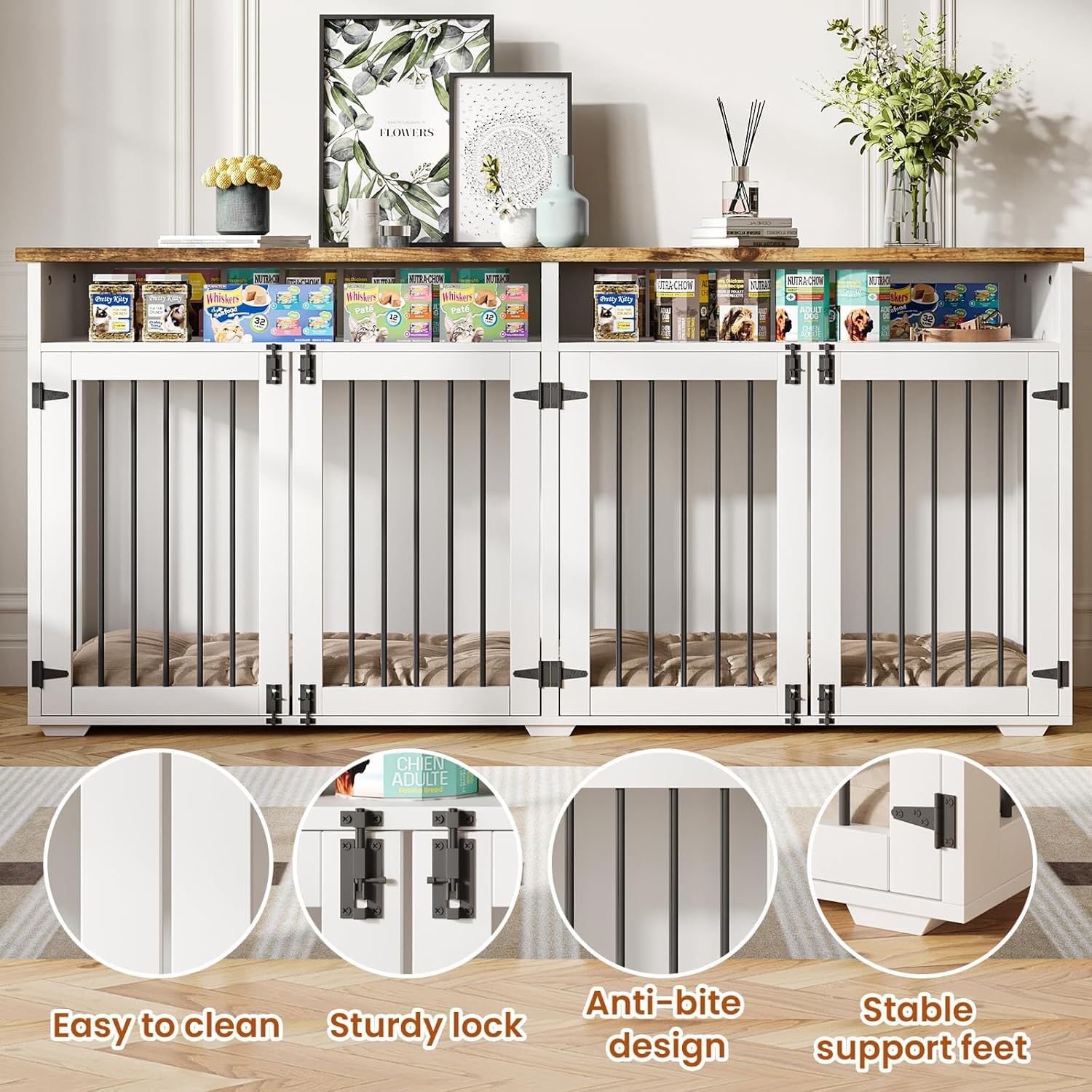 - PLENTY OF STORAGE SPACE: This indoor dog kennel indoor has 2 spacious storage compartments on the upper part of the crate, which is convenient for you to store dog food, dog toys, leashes and other essentials, fully meeting your storage needs for pet supplies, and the top counter can be used for your decorations, photo frames and so on