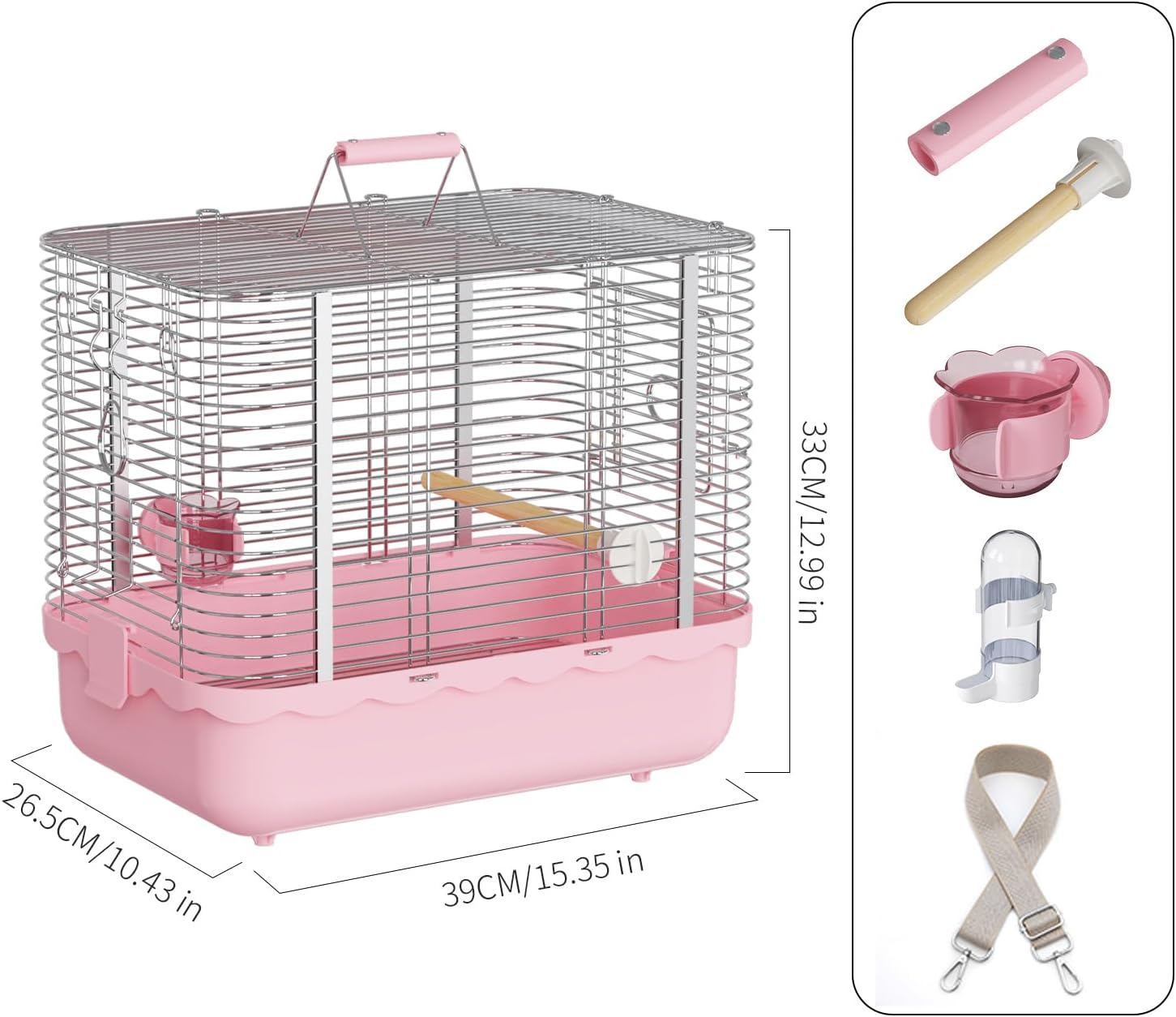 Bird Carrier Travel Cage, Durable Portable Stainless Steel Birdcage with Bird Perch & Feeding Bowl for Parrots Canaries Budgies Lovebirds Conures Cockatiels (Large Pink)