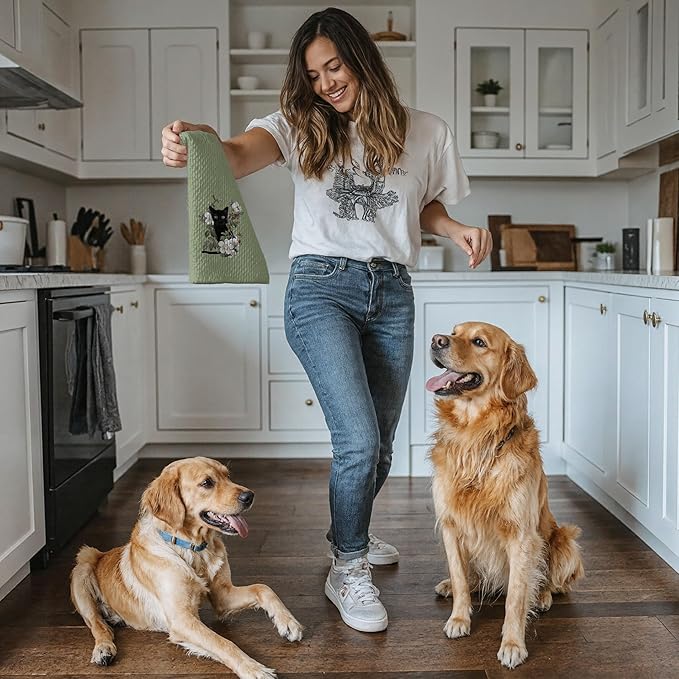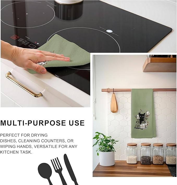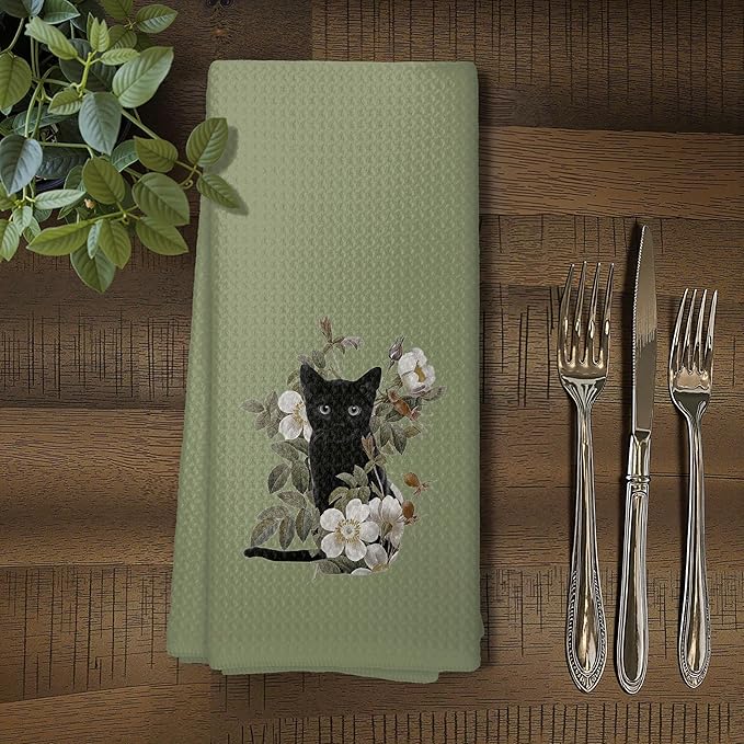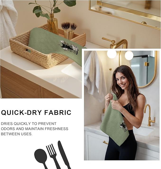Black Cat Gifts Kitchen Dish Towels Hand Towels for Bathroom Kitchen Decor, Gifts for Cat Mom Lover and Women,16x24 Inch(Green)