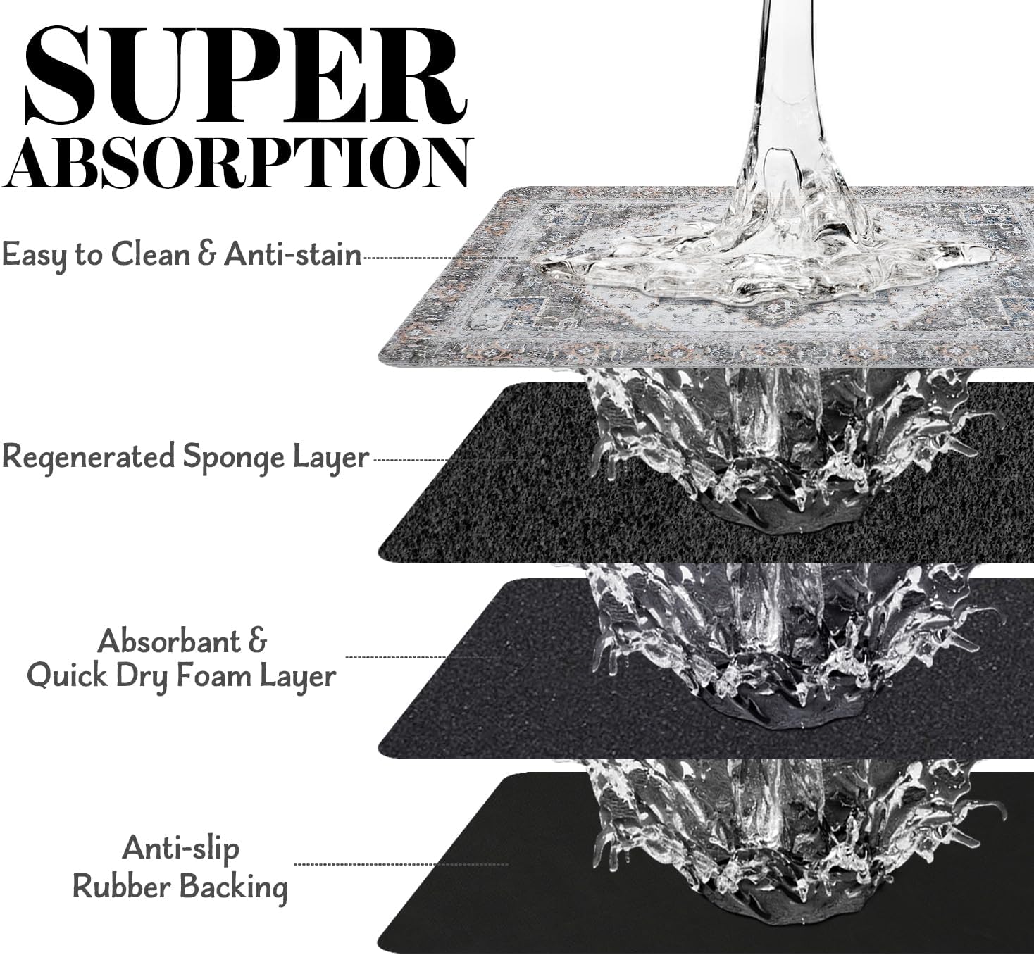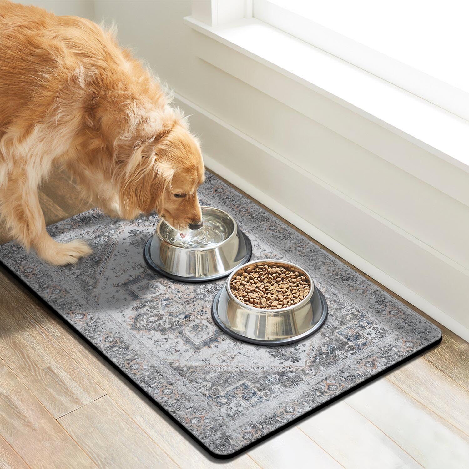 - Super Absorption: The dog mat for water bowl can absorb spilled water without leaving traces and dry quick, avoid wetting pet paws even for messy drinkers. And it does not attract pet hair like traditional silicone dog bowl mat.