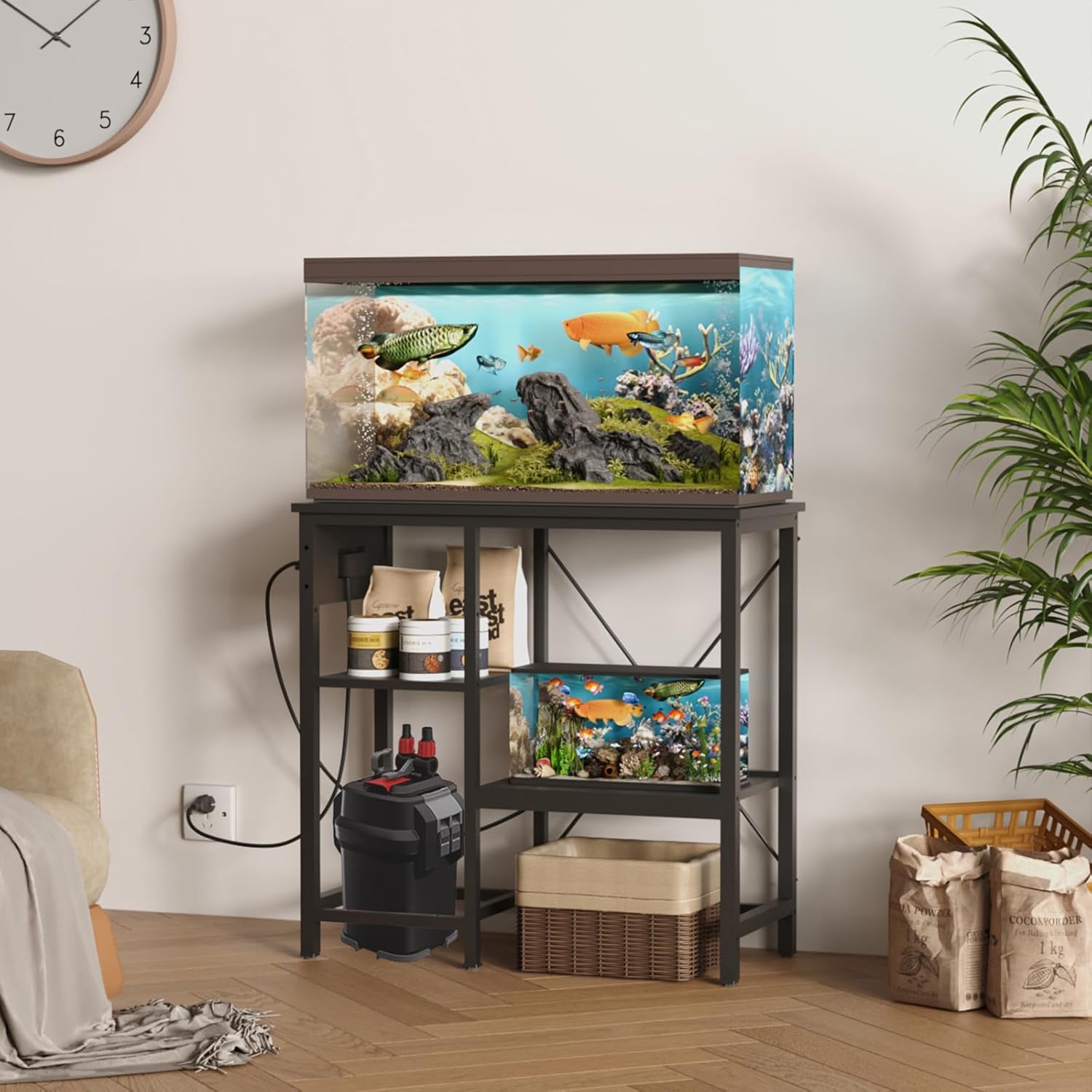 - With Plug and LED Lights: The black aquarium stand comes with 2 power outlets and 2 USB ports for easy connection of electronic devices such as heating rods, filters, and oxygenation pumps . With colorful LED light strips to give your aquarium a more ambient feel