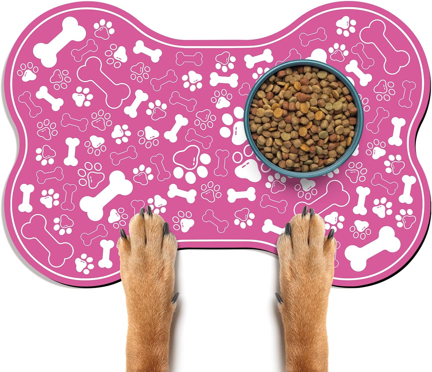 Dog & Cat Food Mat Bone Shaped Pet Feeding Mat Quick Absorb Water Bowl Placemat with Rubber Backing Indoor Floor Stain Resistant Pet Accessory Supplies (Pink, 16x24 Inches)