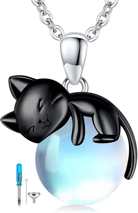 - ๐โโฌ Black Cat Urn Necklace Design: This elegant black cat urn necklace is crafted from sterling silver and features a moonstone cat pendant. It is a meaningful choice for storing ashes as a memorial tribute. Suitable for both women and men, this unique piece of jewelry serves as a heartfelt and stylish way to honor the memory of a loved one.