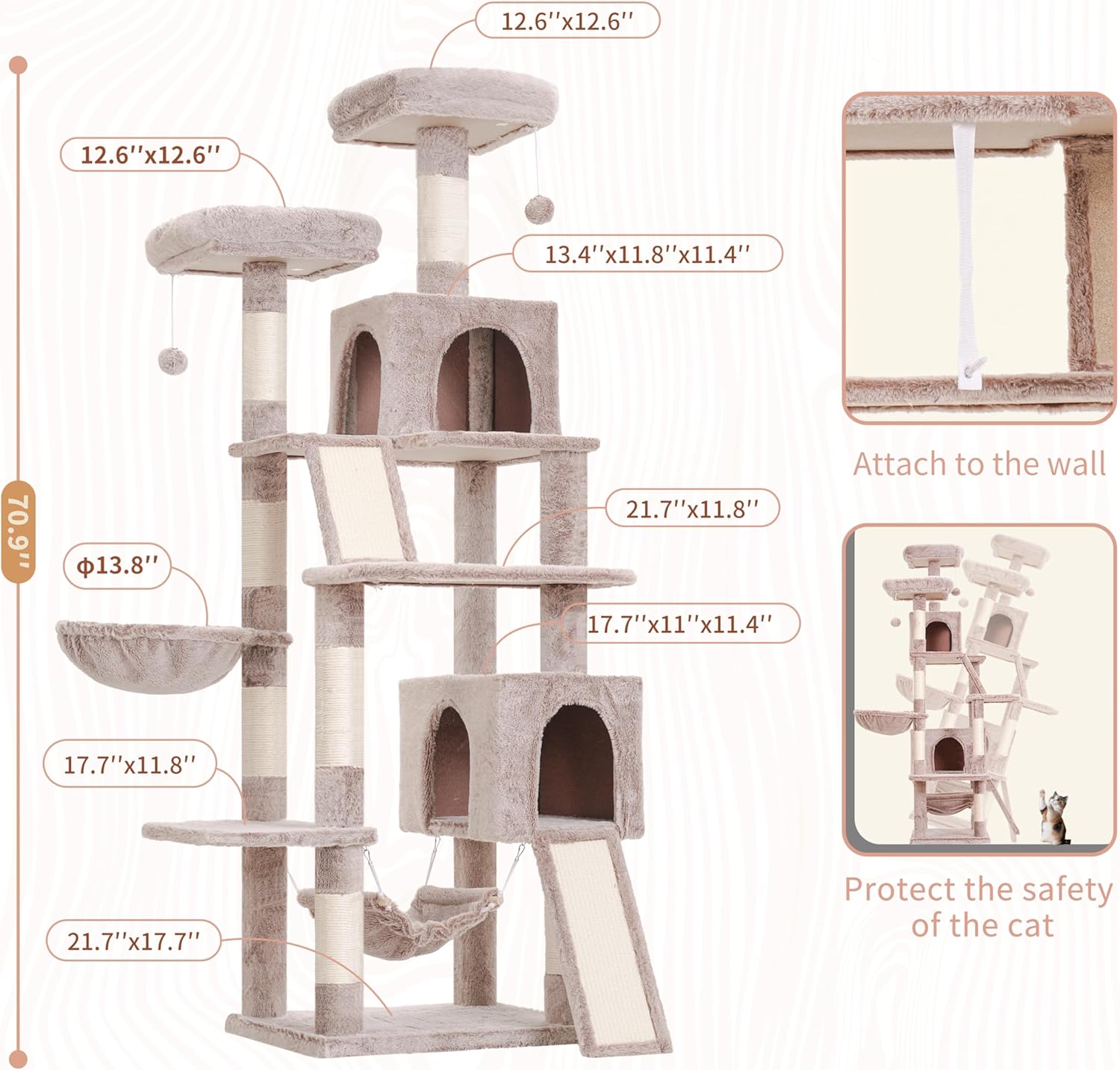 Cat Tree for Indoor Cats, 71'' (180cm) Multi-Level Cat Tower for Large Adult, Sturdy Cat Tree House with 2 Scratching Boards 7 Posts, 2 Plush Perches/Condos, Hammock, Muchroom GCT032MU