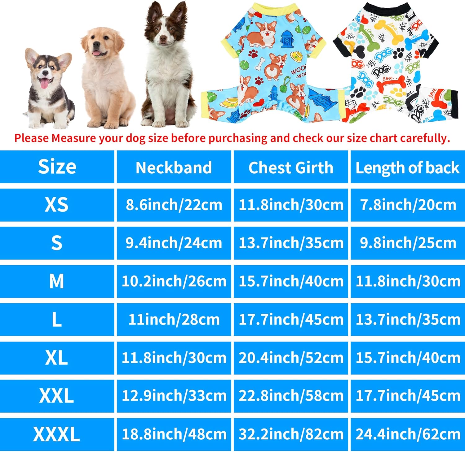 - Dog Pajamas Size:There are 7 different size from XS S M L to XL XXL XXXL for choice. Please measure the chest girth and back length of your pet, and refer to the size chart before ordering, and note that your pet usually wearing a small size does not mean that all small sizes are suitable for him or her; If the size of the pet is close to the upper limit of the size chart, please choose a larger size