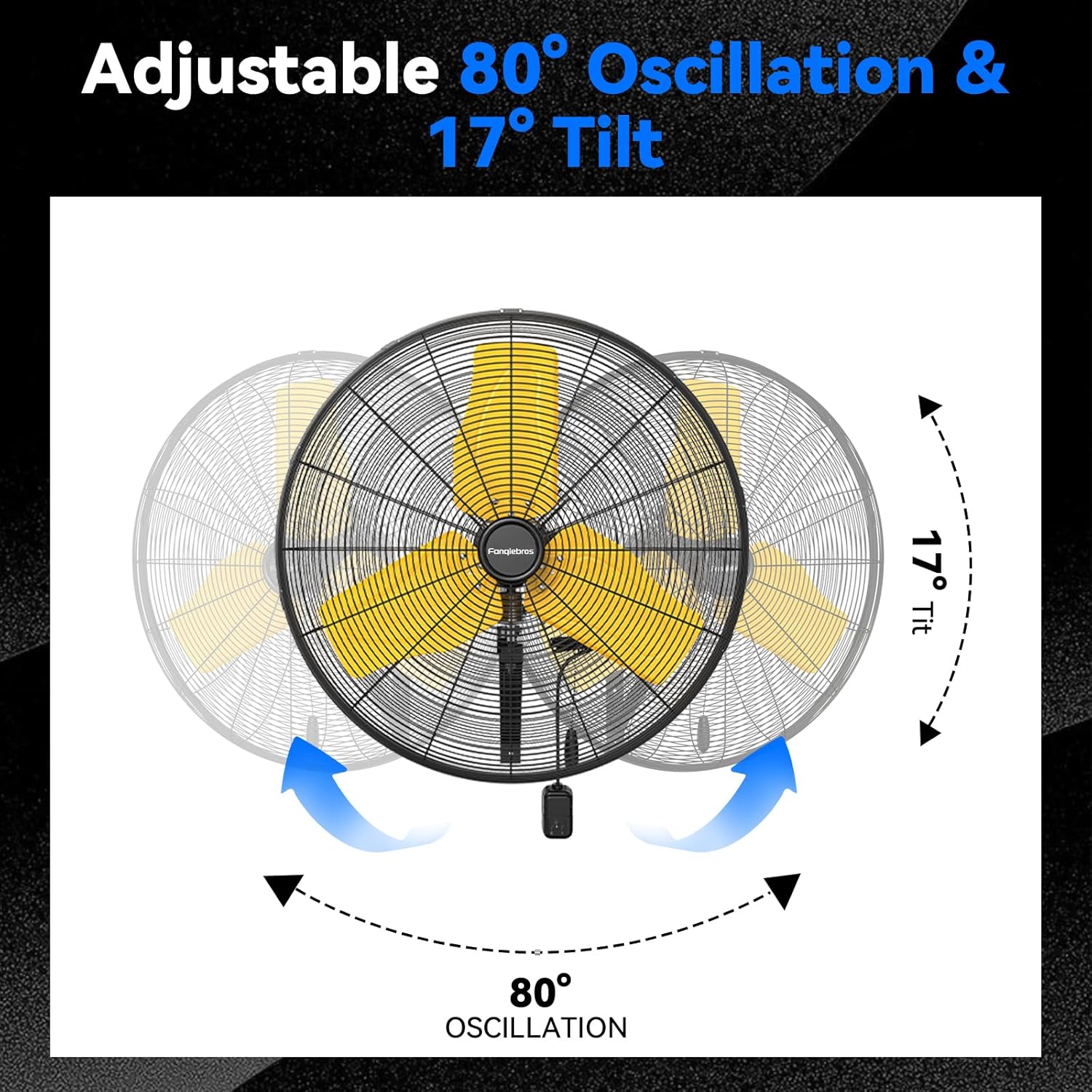 - 𝐓𝐢𝐥𝐭𝐢𝐧𝐠 & 𝐎𝐬𝐜𝐢𝐥𝐥𝐚𝐭𝐢𝐧𝐠 - The heavy-duty mental wall fan provides an automatic oscillation function of 80 degrees left and right, and the vertical tilt angle can be adjusted up to 17 degrees, helping you easily adjust the wind direction and enjoy the best comfort