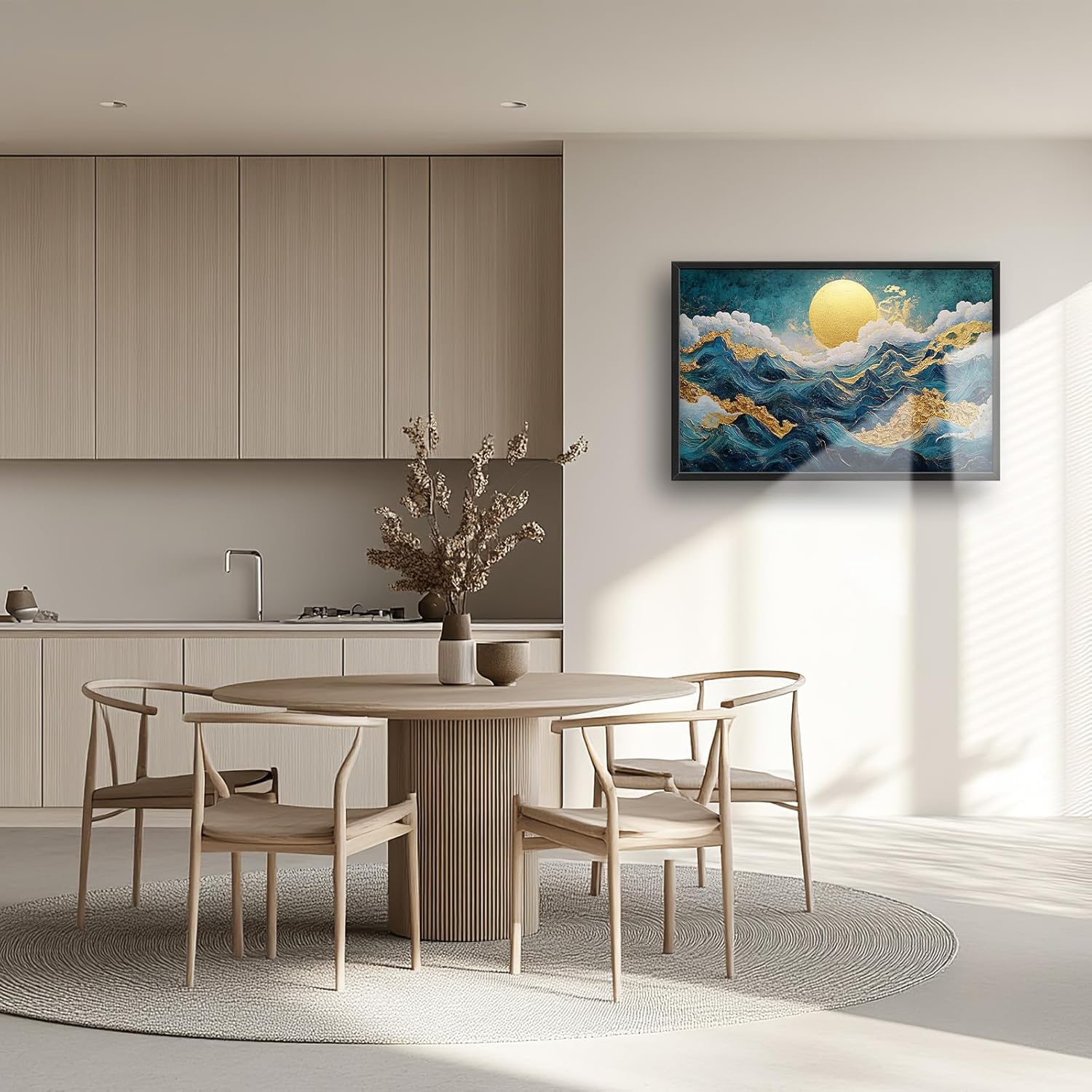 Framed Large Sun Mountain Wall Art, Oversized Teal and Golden Sun Wall Decor for Living Room, Abstract Landscape Canvas Painting Modern Artwork Home Decoration for Living Room Bedroom 36"x24"