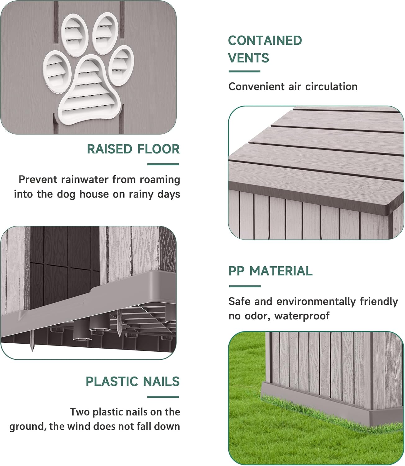 - Strong and Stable: To ensure that the dog house is stable and reliable, we have equipped it with three plastic nails. These pegs can firmly fix the dog house on the grass, preventing it from moving easily due to your dog's activities or external factors such as wind.