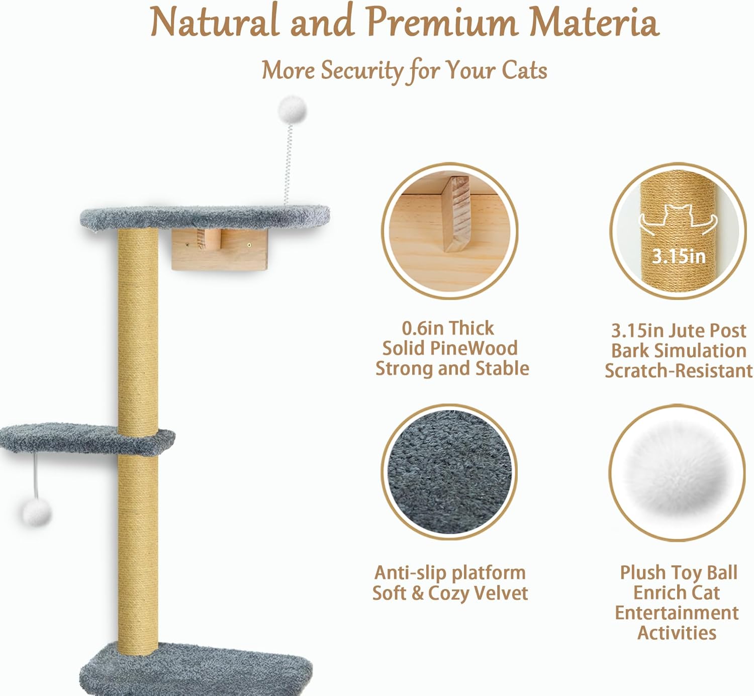 - Ideal for Apartments & Minimalist Interiors: Utilize vertical wall space and free up your floors. This space-saving cat tower turns blank walls into functional play areas without clutter. Its clean design and neutral grey plush integrate easily with modern décor, making it a discreet yet dynamic solution for small-space cat enrichment.