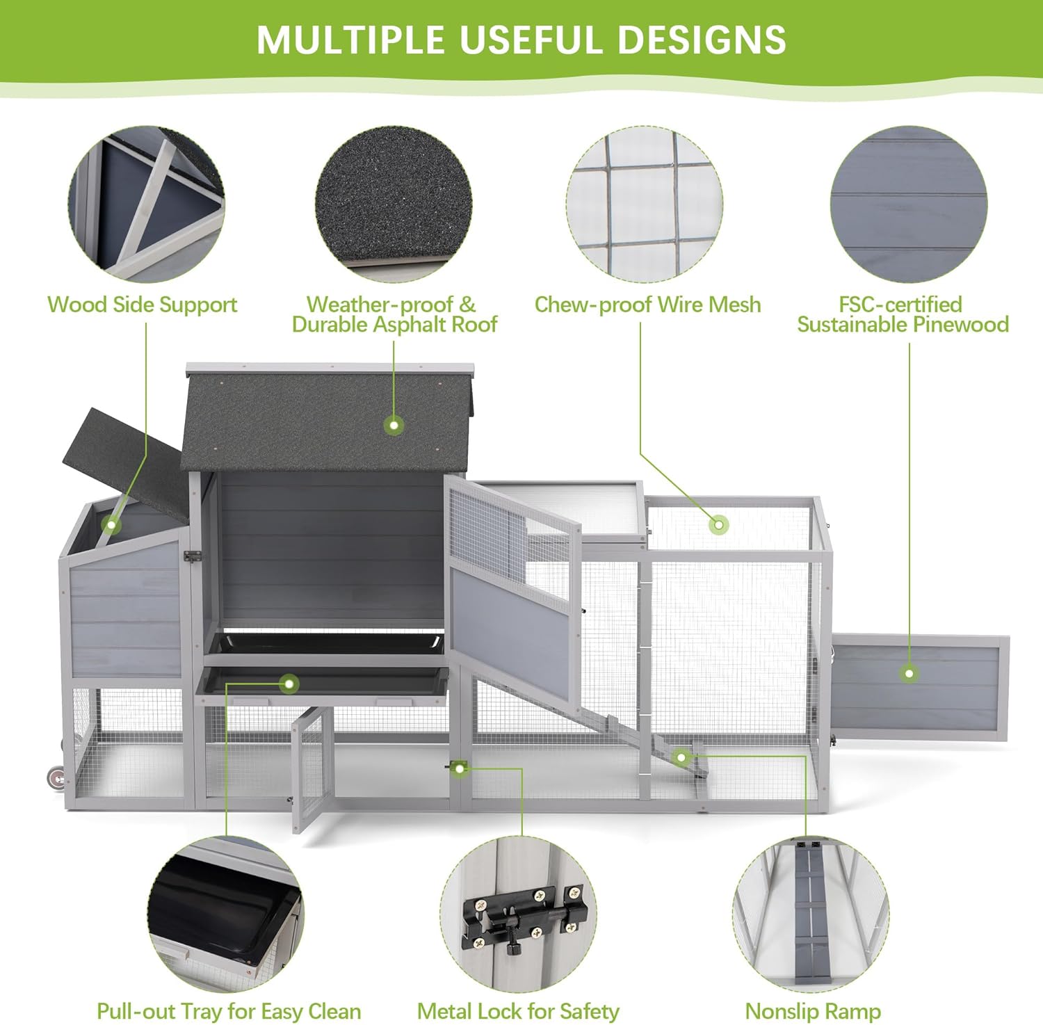 - 【Chicken Coop with Ample Space】: Measuring 82.29 inches in total length, this chicken coop provides chickens with a spacious living area and run area on the ride side for free roaming and exercise freely, suitable for 2 adult chickens or other similar sized pets.
