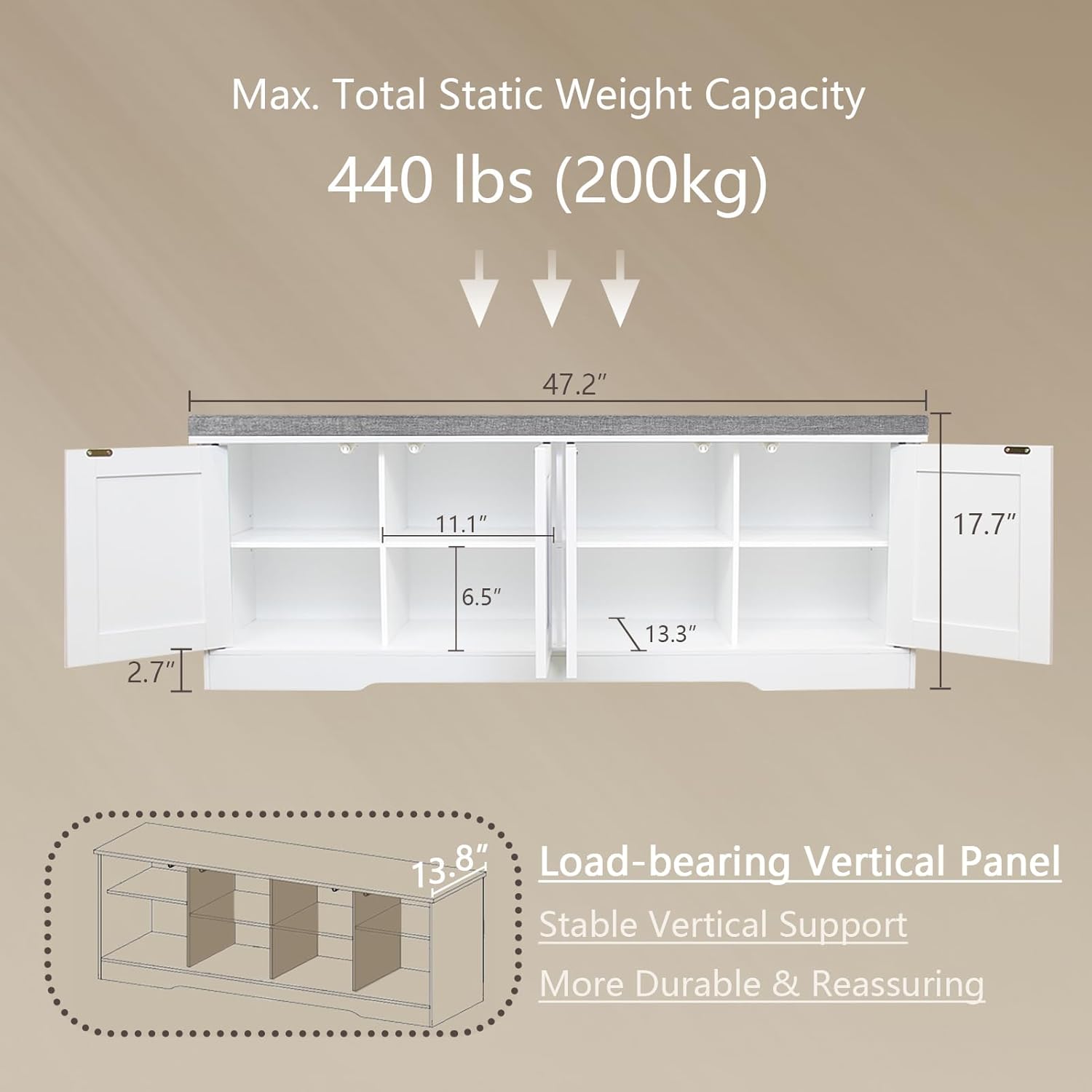 DINZI LVJ Shoe Bench, Entryway Storage Bench with Doors, Cushion, 2-Tier Shoe Rack with 8-Cubby, 47.2”L x 13.8”W Shoe Organizer Cabinet, Adjustable Shelf, Living Room, Bedroom, White