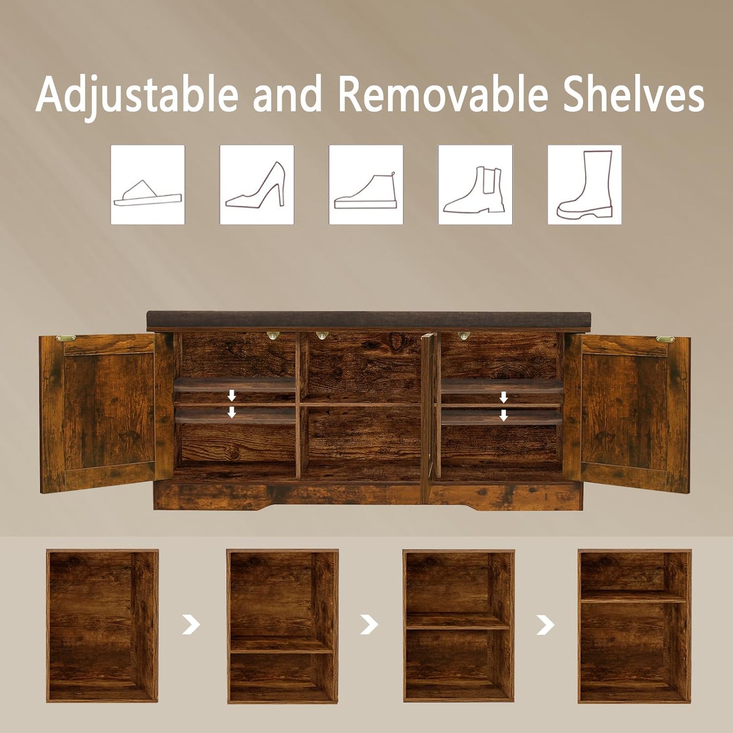 - 【Flexible for Multiple Needs】2 middle compartments are fixed for sneakers, high heels and sandals. The side compartments have 3 adjustable heights for slippers, tall boots or storage boxes. Use as an entryway bench, window seat or bedside bench to store blankets and books in the living room and bedroom