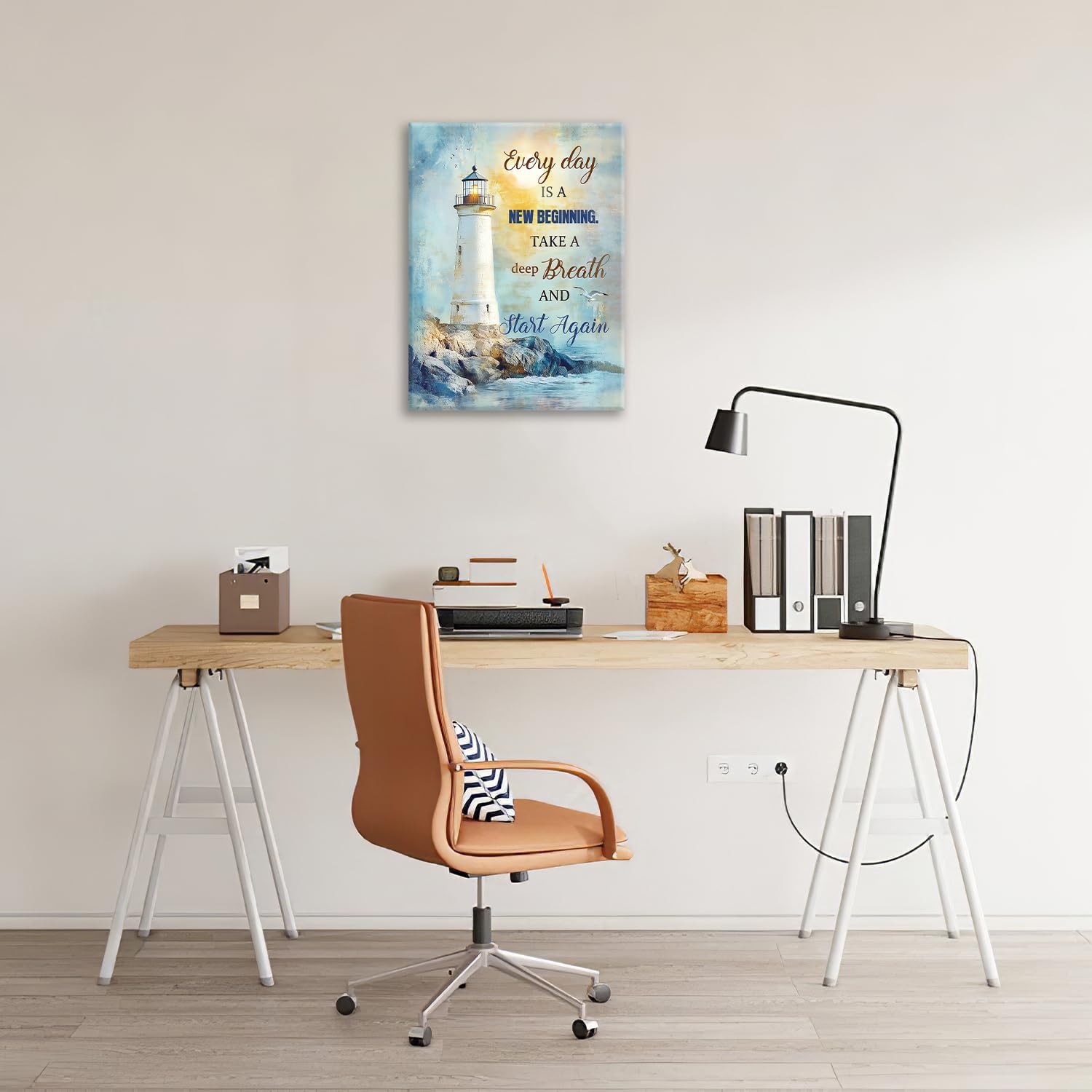 Ocean Lighthouse Pictures Wall Art, Coastal Nautical Bathroom Wall Decor Every Day is a New Beginning Motivational Quote Framed Painting Canvas Artwork for Bedroom Living Room Decorations 20"L x 16"W