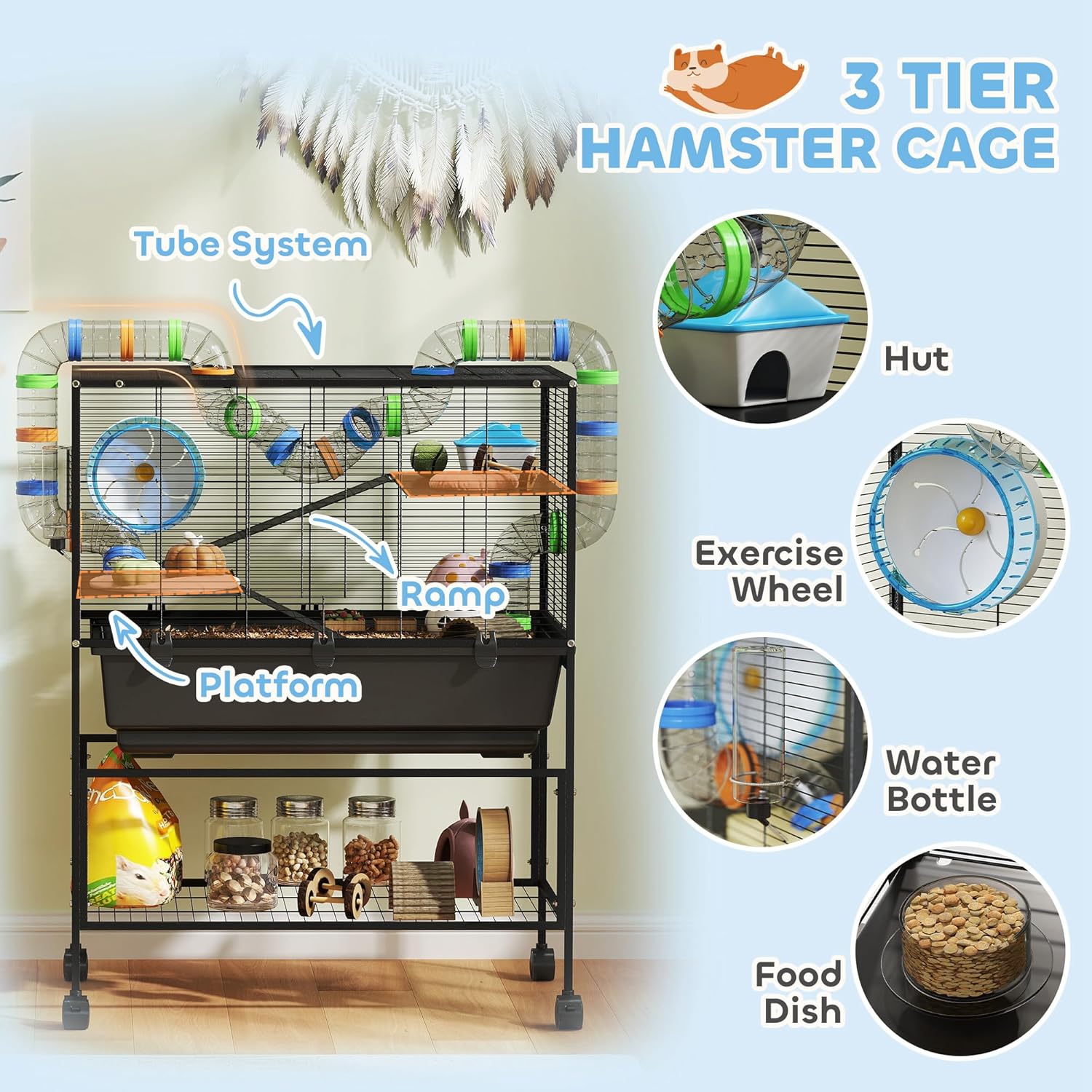 - Spacious 3-Tier Design: Colorful 2.8" tubes link vibrant floors for climbing, nesting, and zoomies. Includes a hut, food dish, water bottle, and 7.5" exercise wheel, this hamster habitat is more suitable for Syrian hamster and gerbil