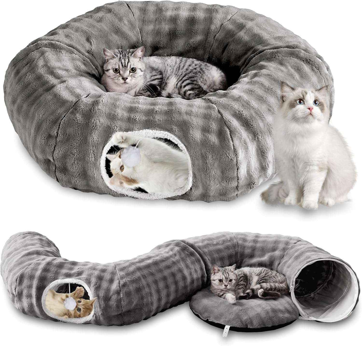 - Easy to Assemble and Care: The design of this donut cat tunnel bed takes into account your convenience, making it easy to assemble and quick to store. The inner bed is removeable, machine washable and easy to clean. In addition, the non-slip bottom keeps the tunnel safe in space, creating a stable and comfortable environment to your pets to play and rest