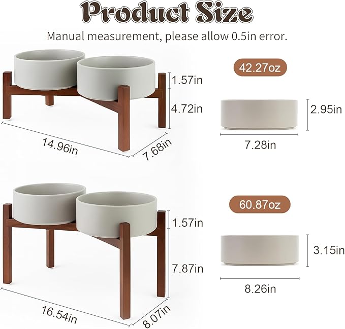 - UPGRADED ACACIA WOOD SHELF: Compared to the usual wood stand, this feeding bowl uses higher quality acacia wood, which not only enhances the overall stability and durability, but also the natural wood grain and warm tone of the wood stand can beautify the home space. The acacia wood stand has better durability and maintains a stable temperament even in humid environments
