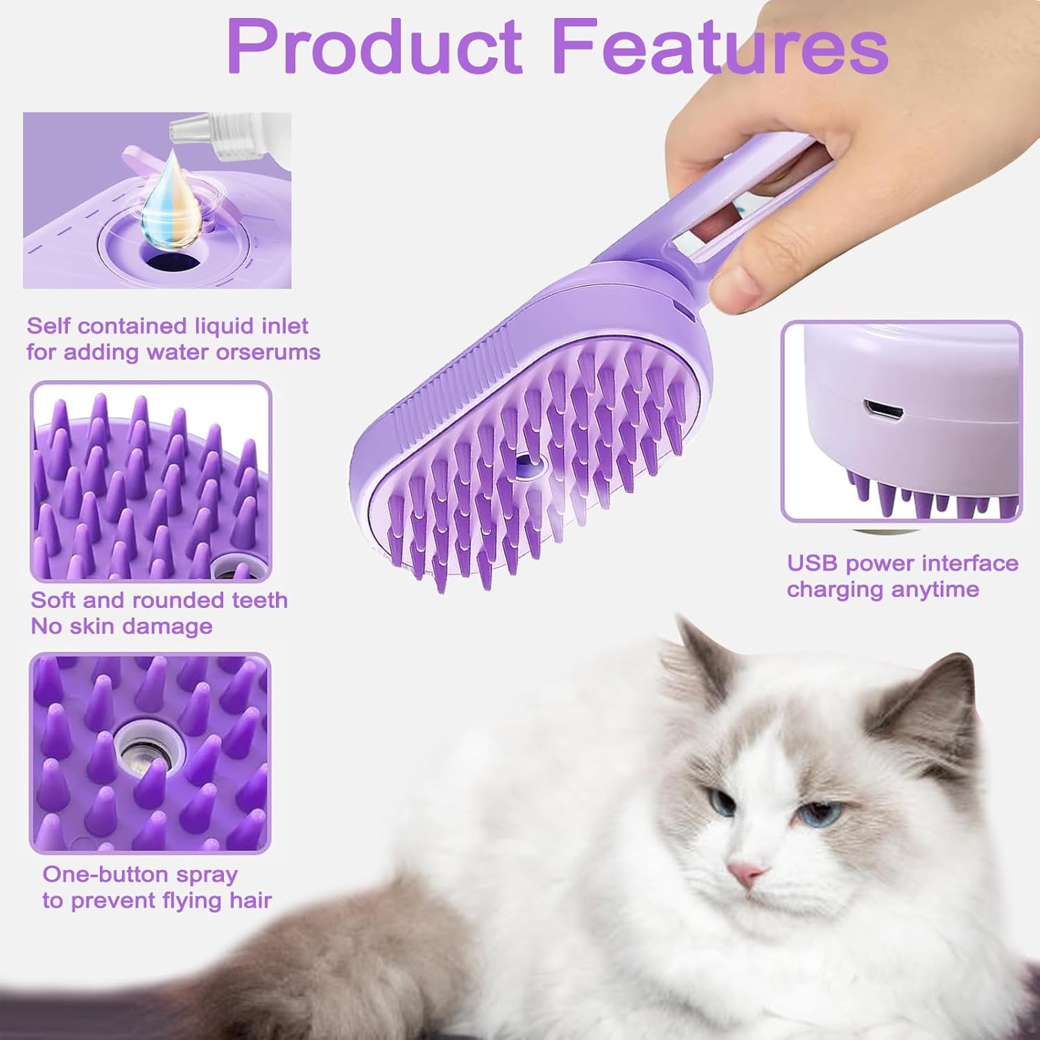 - 【Spray Anti-Static】The steam brush for cats features a built-in misting system that gently sprays water to eliminate static and reduce flying fur, keeping your home cleaner. Equipped with water tank, you can add water or a water-soluble care solution, significantly reducing the need for baths. This is a real lifesaver for cats who hate water!