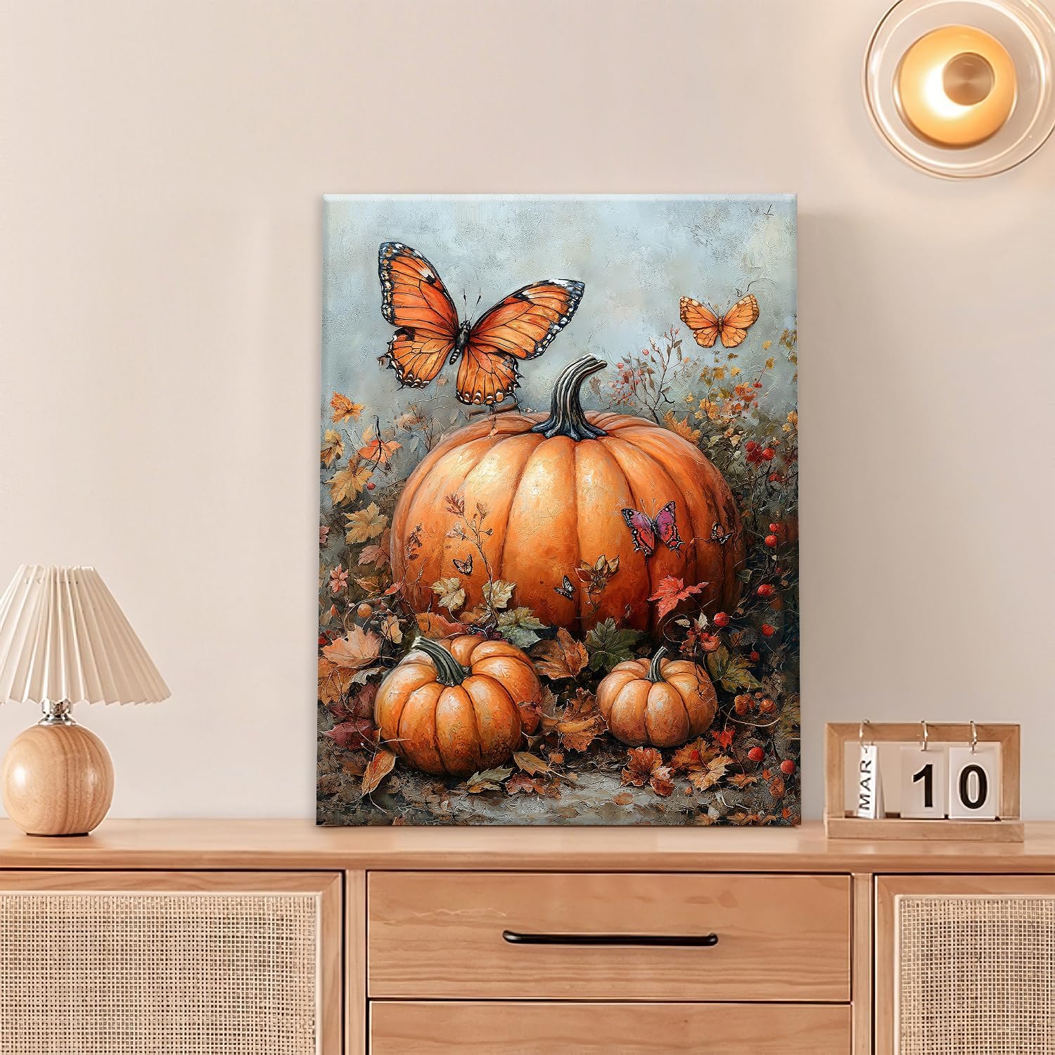 Fall Pumpkin Pictures Wall Art, Rustic Thanksgiving Bathroom Wall Decor, Farmhouse Autumn Butterfly Framed Painting Canvas Artwork for Harvest Gift Bedroom Living Room Decorations 20"L x 16"W