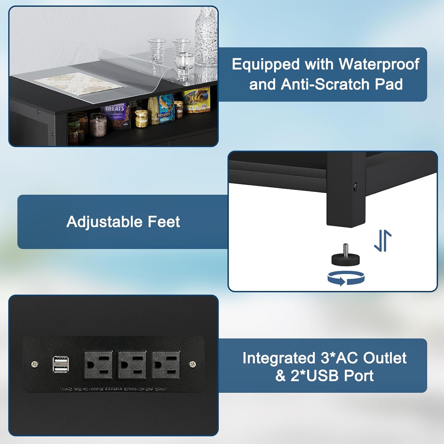 - Power Outlet – Never worry about tangled cords again! This advanced aquarium stand comes equipped with a built-in power strip featuring 3 AC outlets and 2 USB ports, making it effortless to power heaters, filters, pumps, and LED lights—all while keeping wires neatly organized.