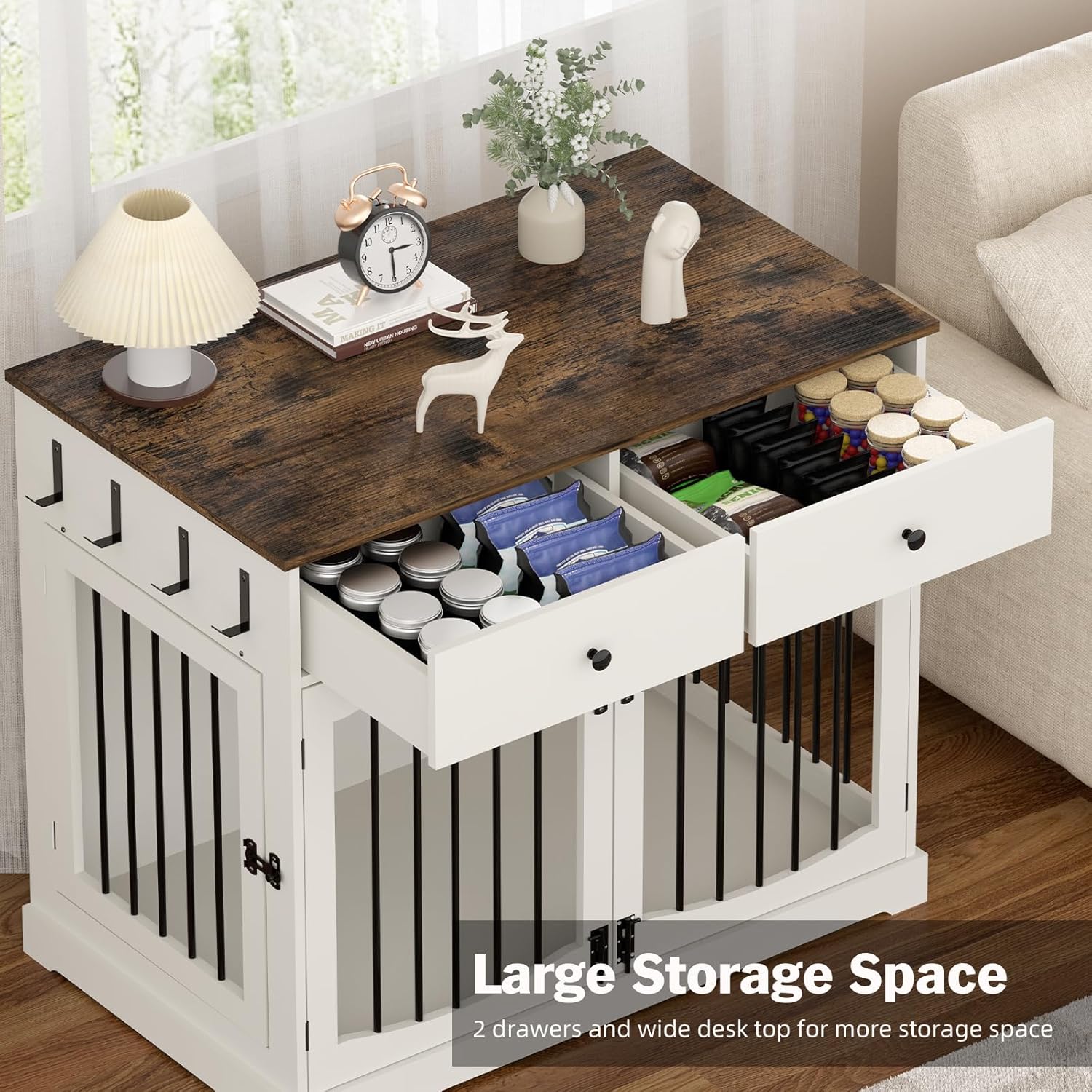 - Tons of Storage Space-Not just a kennel! Enjoy a sturdy top shelf that holds 150-200 lbs ideal for plants, photos, or decor. Two spacious drawers store food, toys, or treats, while side hooks keep leashes, collars, and pet essentials organized