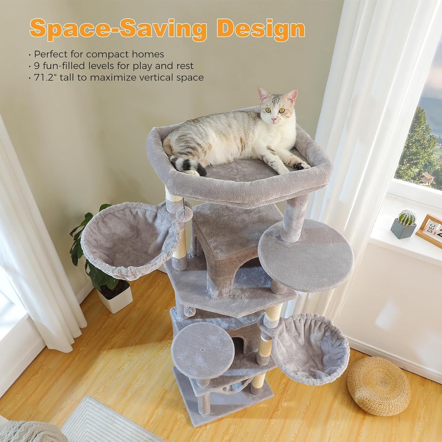71.2" Tall Cat Tree for Indoor Cats - 9-Level Multi-Cat Tower w/5 Sisal Scratching Posts, 2 Condos, 3 Hammocks, Perch & Pom Poms - Heavy-Duty for Adult Cats, Space-Saving Plush Gray