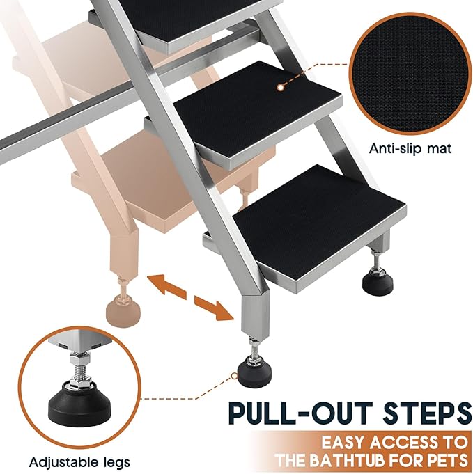 - Safe & Convenient Access: Designed with non-slip steps for stable entry, this pet bathtub ensures pets can move in and out safely. The swing-out door adds extra ease for both pet owners and groomers.
