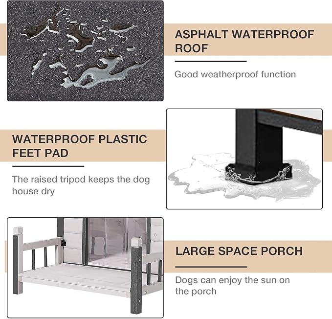 - WEATHERPROOF DESIGN FOR SAFETY: Equipped with an asphalt roof and water-resistant Plastic Feet Pad, our Dog House offers a raised floor for ultimate weatherproofing.Keep your pet stays dry and protected. It's a ideal choice for any outdoor space