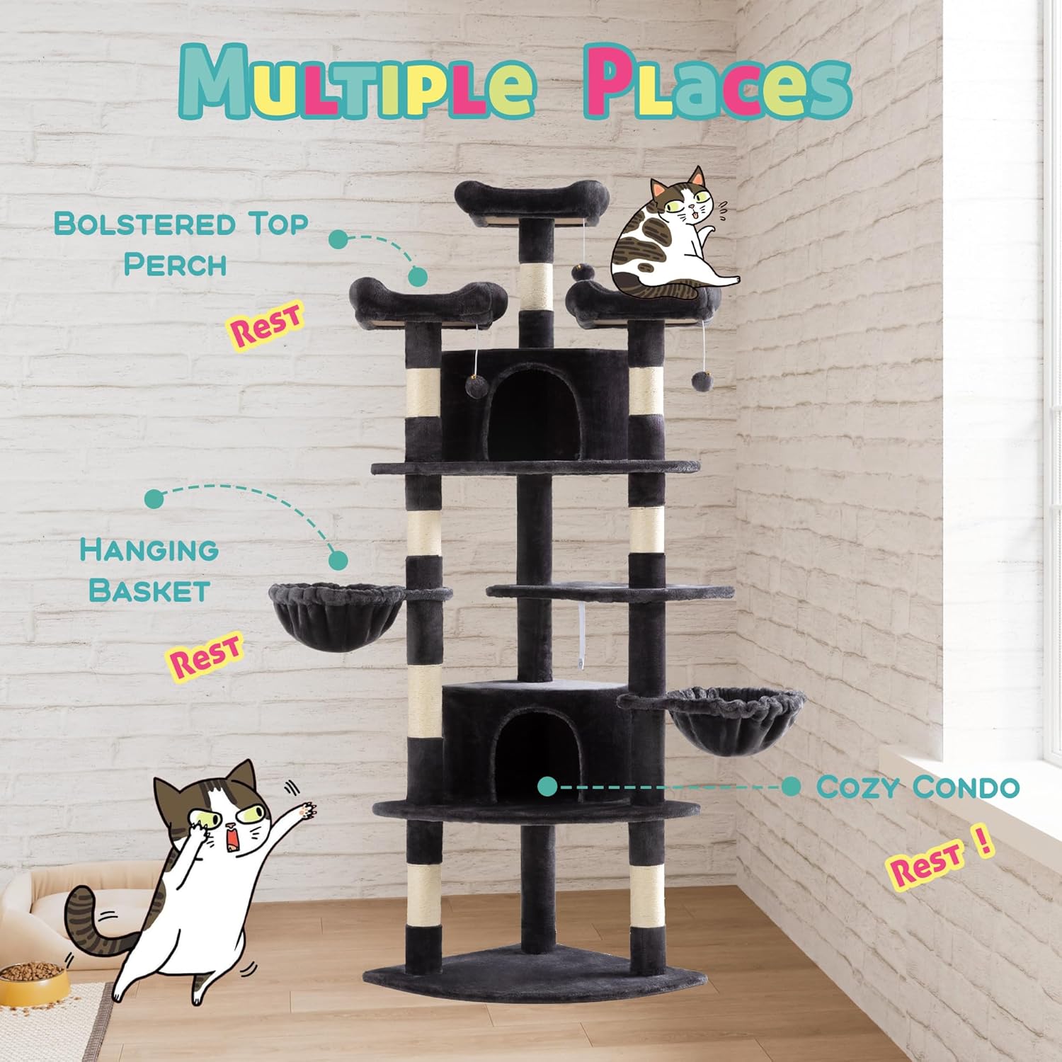 SHA CERLIN 73in Fan-Shaped Corner Cat Tower for Save Space/Multi-Level Tall Cat Tree for Indoor Kitties/Condo with Baskets/Cozy Perches/Sisal Scratching Posts/Pet Activity House/Dark Grey