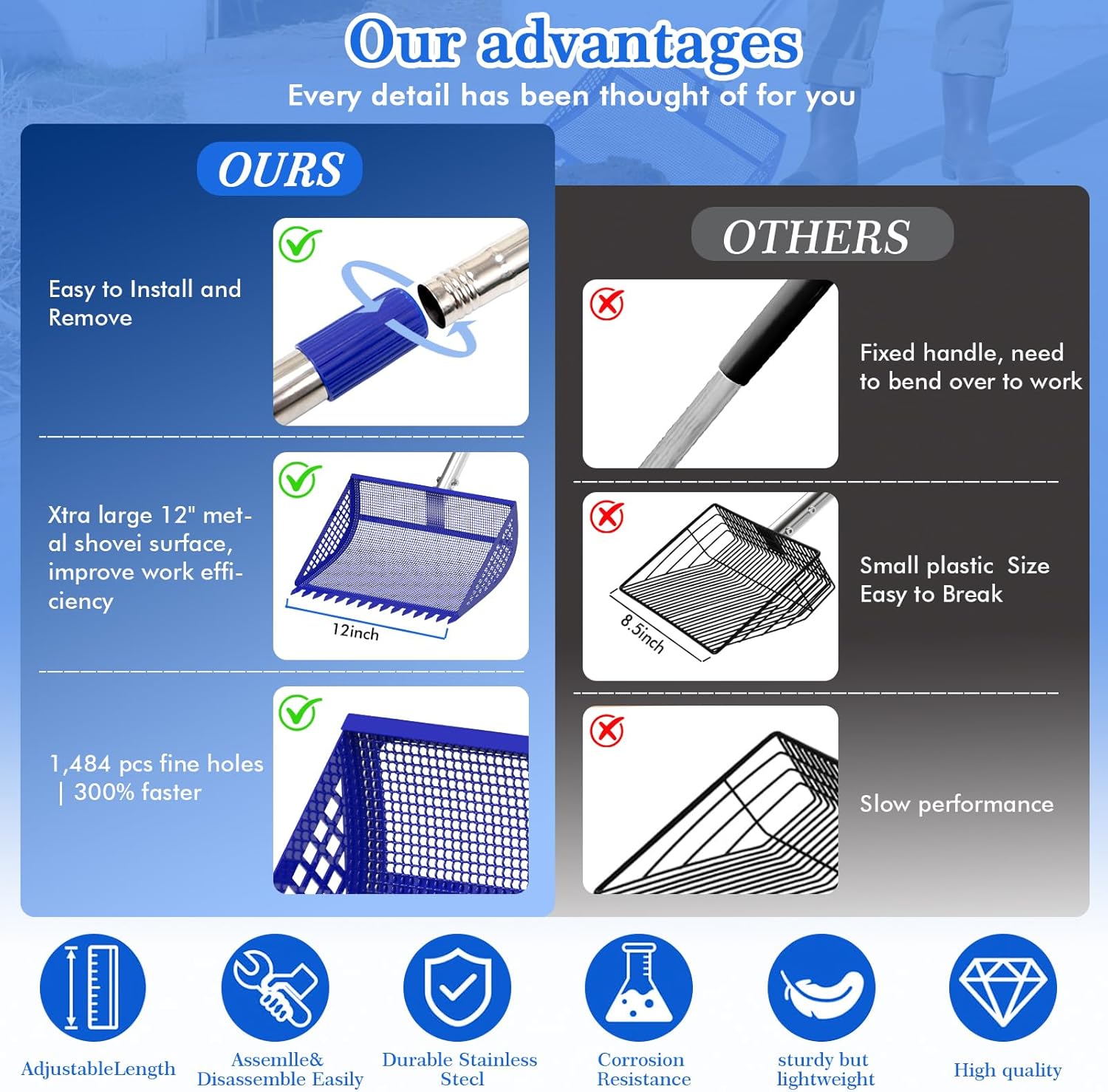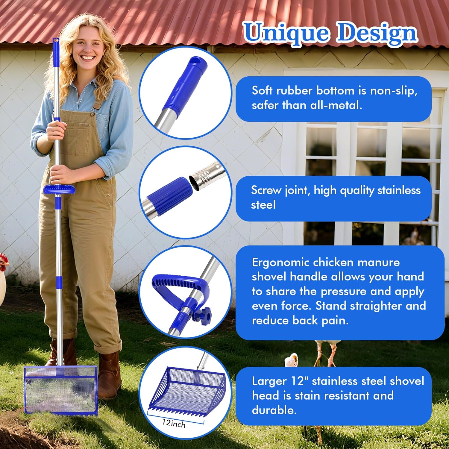 - Large-Capacity Metal Chicken Poop Scooper : Constructed with a heavy-duty metal shovel head and rake, paired with a 304 stainless steel handle and an adjustable soft rubber grip, it is suitable for use year-round. The metal-toothed chicken manure shovel head measures 12 inches in width, with a curved groove design significantly increasing the shovel's capacity, enabling it to scoop and sift waste in a single pass, greatly enhancing work efficiency.