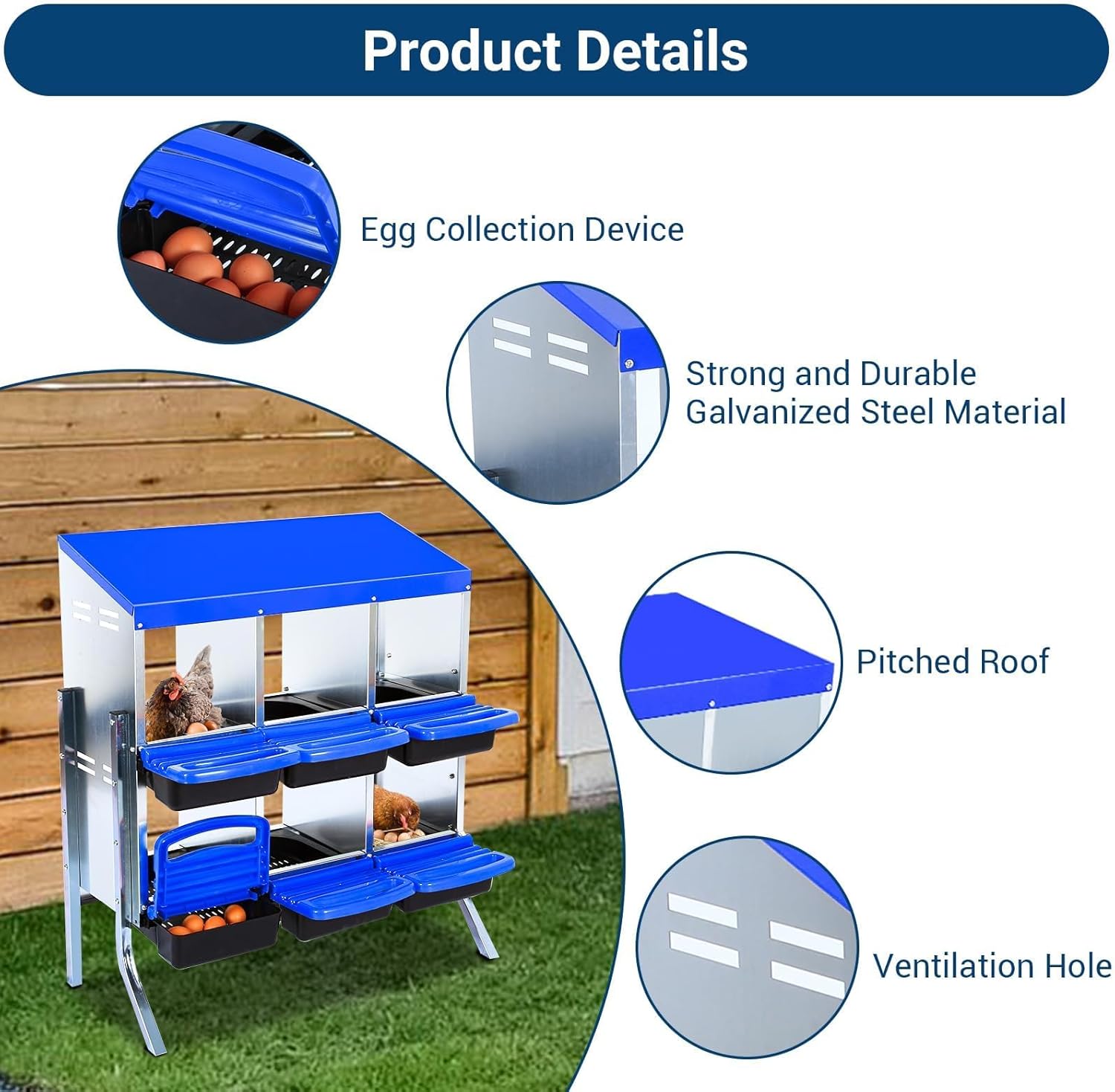 - 【Sturdy Construction】--Carefully constructed from high quality galvanized steel, our chicken nesting boxes boasts a robust and long-lasting design. The egg laying tray is made of plastic, which is lightweight and rust-resistant. The integrated ventilation holes ensure excellent airflow, keeping the box cool and dry.