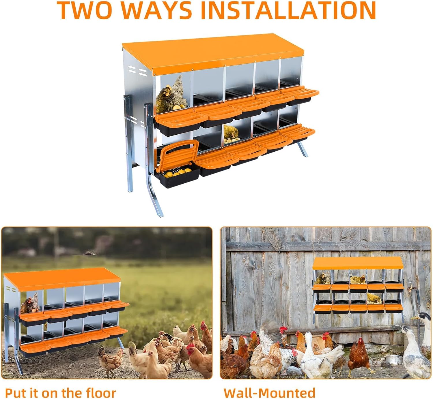 - 【Versatile Installation】--Our chicken laying boxes offers two installation options for your convenience. Use the included metal legs for a free-standing setup on the ground, or mount it on the wall using the built-in hanging holes.