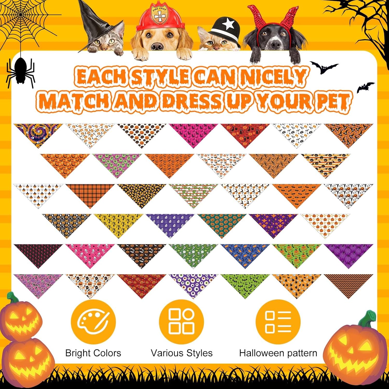 - Halloween Dog Bandanas Bulk: This bulk set includes 120 Halloween dog bandanas in 40 different styles, 3 pieces each, giving you plenty of variety for everyday wear, holiday photos, or party costumes. Share them with friends, shelters, or use as festive pet gifts