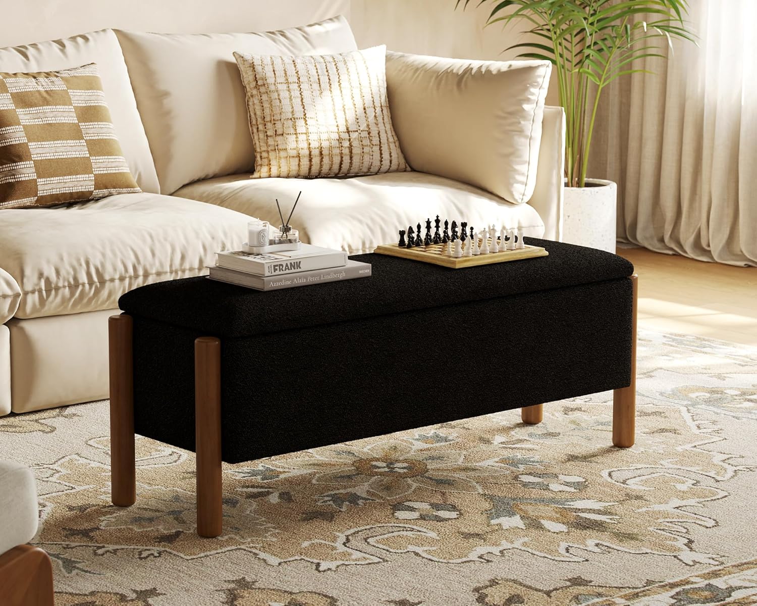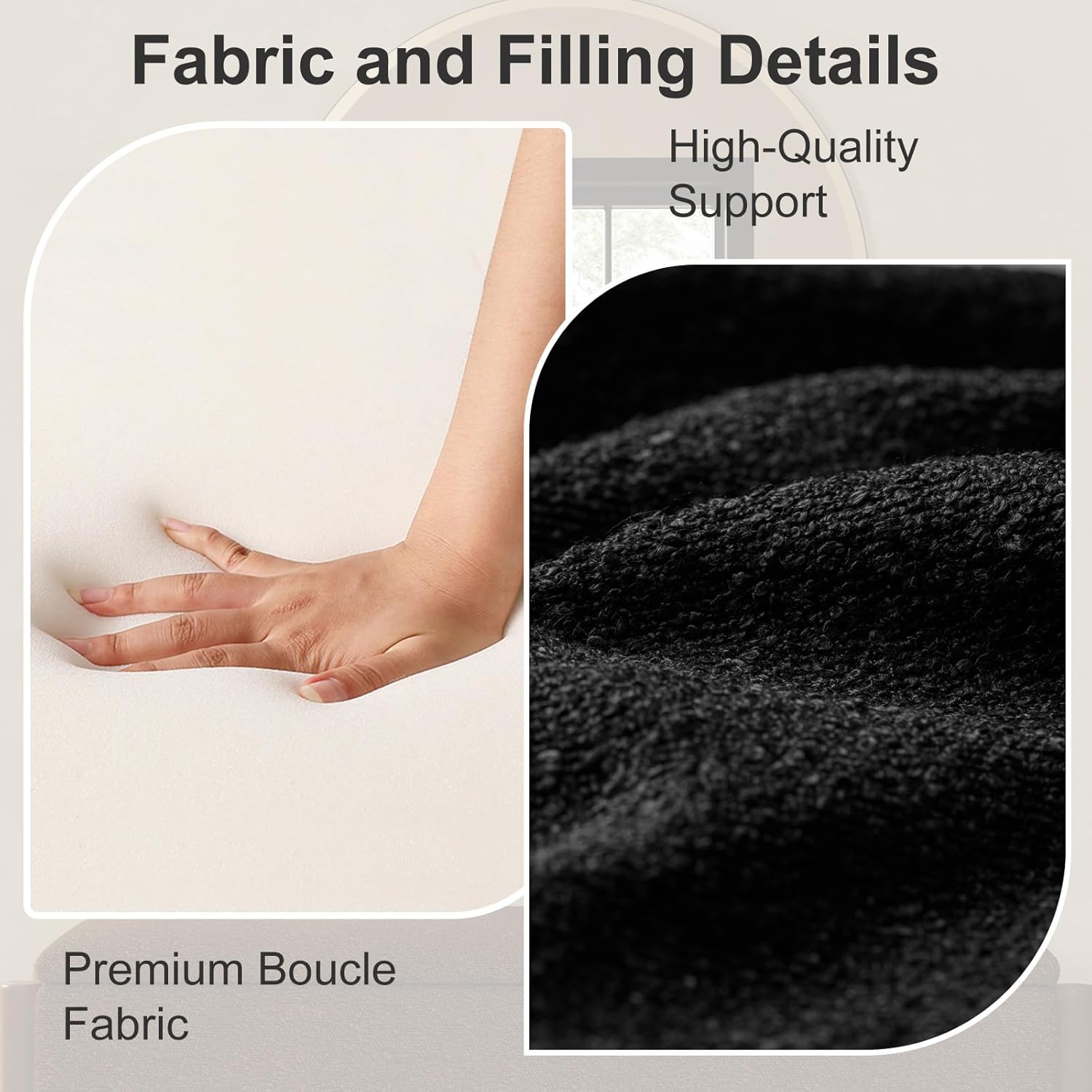 - Soft Boucle Fabric and High-Density Padding: Ottoman with storage features luxurious boucle upholstery for a soft, comfortable seat. This storage ottoman's durable fabric and high-density foam padding offer excellent support. Whether used as seating, a footrest, or an accent piece, this storage bench ensures lasting comfort. For bedroom use, it guarantees elegance and comfort. Storage ottomans with such padding are reliable and stylish additions