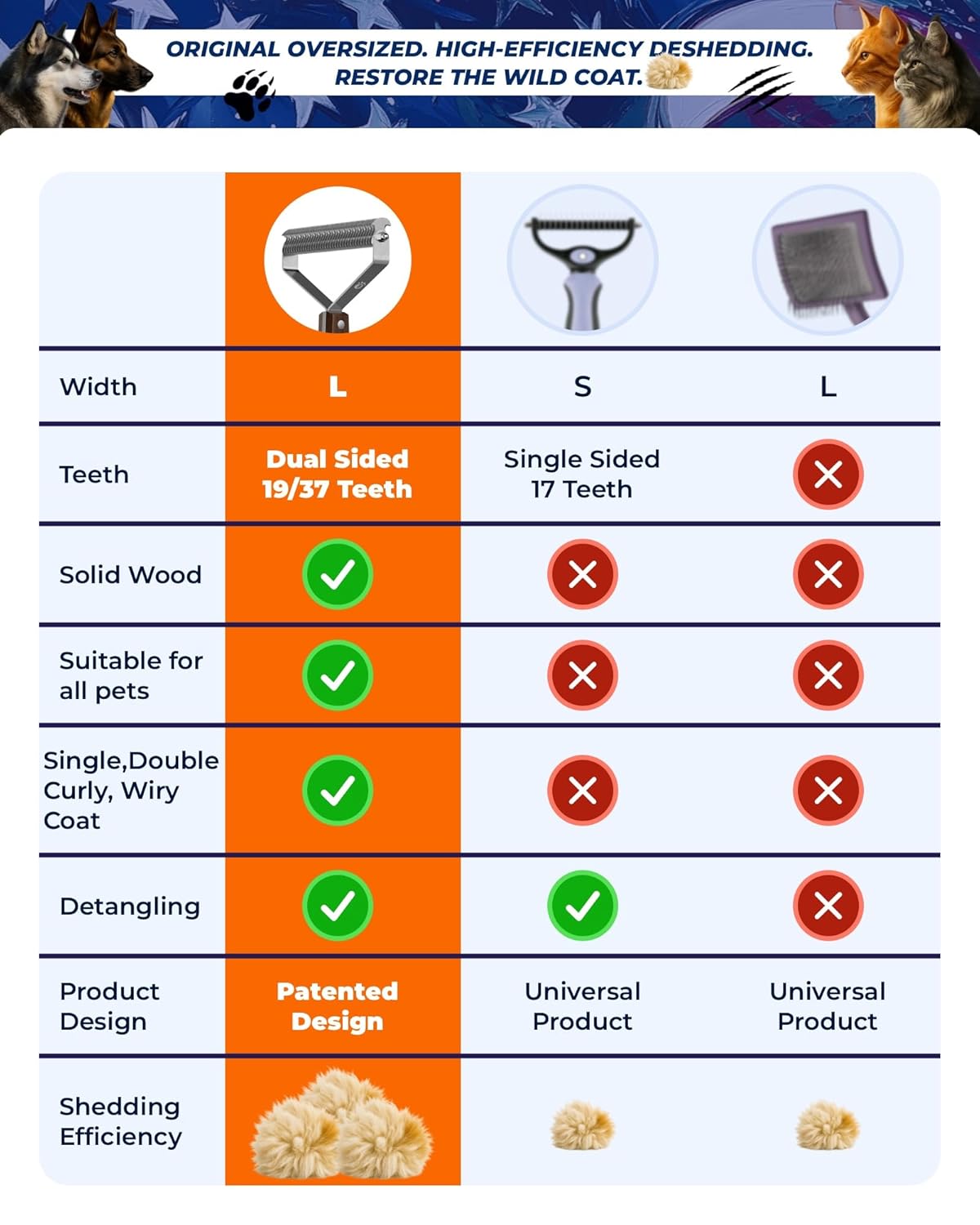Large Dual-Sided Dogs and Cats Brush for Shedding, Unique Blade Designed Deshedding Dog Brush for Long & Short Haired Dogs, Safe&Pro Shedding Tools, Undercoat Rake for All Coats, Premium Walnut Handle