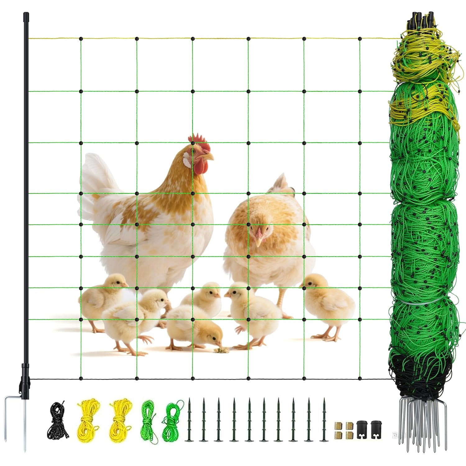 - High-Quality Construction: 164'L x 35.4" Our Electric Fence Netting is crafted from durable PE material and stainless steel mesh, ensuring superior longevity and performance. With 14 pre-assembled fiberglass posts and double-point steel stakes, you can trust in its strength for long-term use.