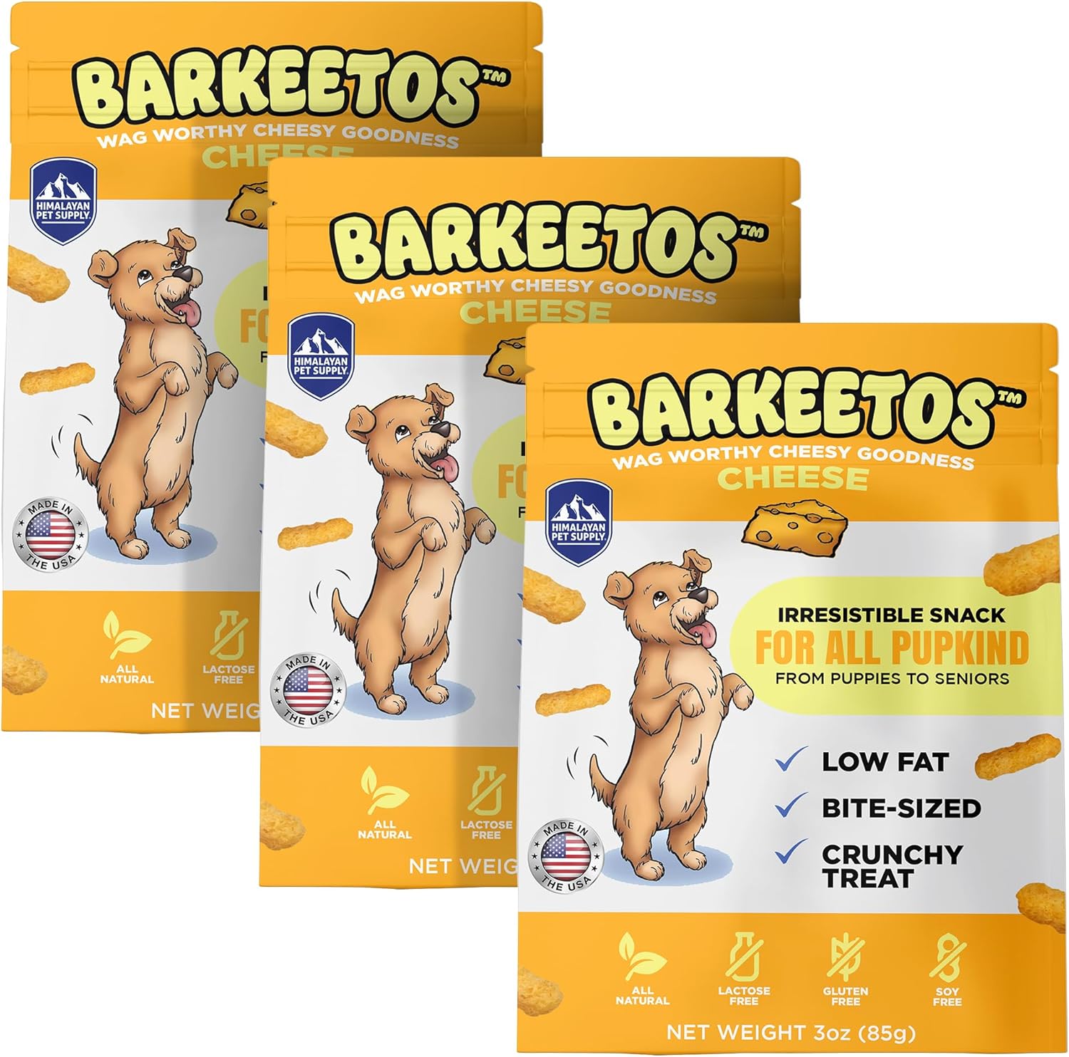 Barkeetos Dog Treats, Crunchy and Cheesy Pet Snacks Made with Real Himalayan Cheese, Gluten Free, Grain Free, Lactose Free, Natural Dog Food for All Breeds and Sizes - 3 Pack